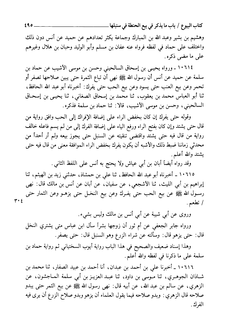 10615 - أَخْبَرَنَاهُ أَبُو عَبْدِ اللهِ الْحَافِظُ , ثنا عَلِيُّ بْنُ حَمْشَاذٍ , حَدَّثَنِي زَيْدُ بْنُ الْهَيْثَمِ , ثنا إِبْرَاهِيمُ بْنُ أَبِي اللَّيْثِ , ثنا الْأَشْجَعِيُّ , عَنْ سُفْيَانَ , عَنْ أَبَانَ , عَنْ أَنَسِ بْنِ مَالِكٍ , قَالَ: §" نَهَى رَسُولُ اللهِ صَلَّى اللهُ عَلَيْهِ وَسَلَّمَ عَنْ بَيْعِ الْحَبِّ حَتَّى يُفْرَكَ , وَعَنْ بَيْعِ النَّخْلِ حَتَّى يَزْهُوَ , وَعَنِ الثِّمَارِ حَتَّى تُطْعَمَ " وَرُوِي عَنْ أَبِي شَيْبَةَ , عَنْ أَبِي أَنَسِ بْنِ مَالِكٍ وَلَيْسَ بِشَيْءٍ , وَرَوَاهُ جَابِرٌ الْجُعْفِيُّ عَنْ أُمِّ ثَوْرٍ أَنَّ زَوْجَهَا بِشْرًا سَأَلَ ابْنَ عَبَّاسٍ مَتَى يَشْتَرِي النَّخْلَ؟ , قَالَ: " حَتَّى يَزْهُوَ " , قَالَ: وَسَأَلْتُهُ عَنْ شِرَاءِ الزَّرْعِ وَهُوَ السُّنْبُلُ , قَالَ: " حَتَّى يَصْفَرَّ " وَهَذَا إِسْنَادٌ ضَعِيفٌ وَالصَّحِيحُ فِي هَذَا الْبَابِ رِوَايَةُ أَيُّوبَ السِّخْتِيَانِيِّ , ثُمَّ رِوَايَةُ حَمَّادِ بْنِ سَلَمَةَ عَلَى مَا ذَكَرْنَا فِي لَفْظِهِ وَاللهُ أَعْلَمُ