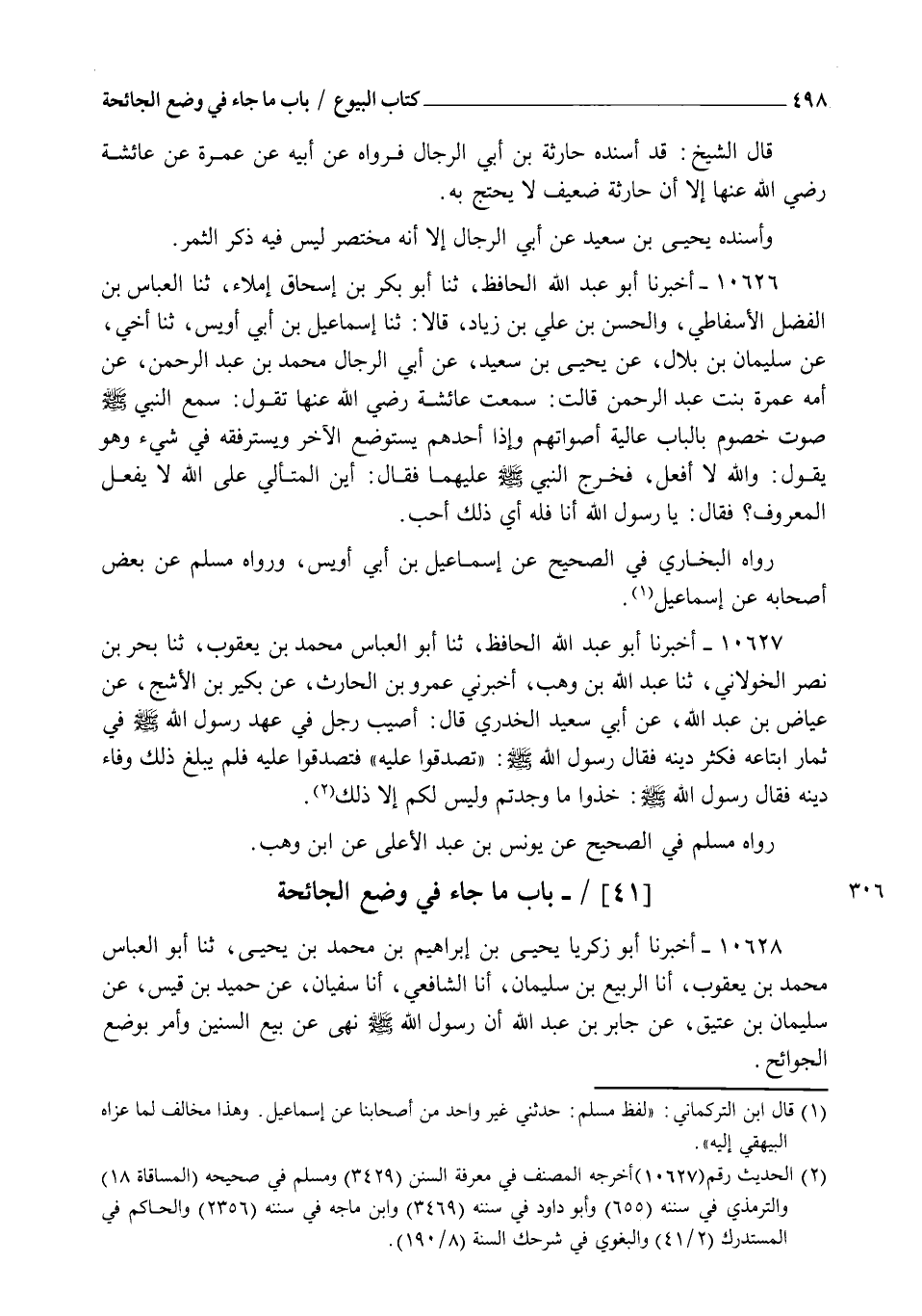 10628 - أَخْبَرَنَا أَبُو زَكَرِيَّا يَحْيَى بْنُ إِبْرَاهِيمَ بْنِ مُحَمَّدِ بْنِ يَحْيَى , ثنا أَبُو الْعَبَّاسِ مُحَمَّدُ بْنُ يَعْقُوبَ , أنا الرَّبِيعُ بْنُ سُلَيْمَانَ , أنا الشَّافِعِيُّ , أنا سُفْيَانُ , عَنْ حُمَيْدِ بْنِ قَيْسٍ , عَنْ سُلَيْمَانَ بْنِ عَتِيقٍ , عَنْ جَابِرِ بْنِ عَبْدِ اللهِ " أَنَّ رَسُولَ اللهِ صَلَّى اللهُ عَلَيْهِ وَسَلَّمَ §نَهَى عَنْ بَيْعِ السِّنِينَ , وَأَمَرَ بِوَضْعِ الْجَوَائِحَ " -[499]- أَخْرَجَهُ مُسْلِمٌ مُقَطَّعًا فَرَوَى حَدِيثَ النَّهْيِ عَنْ أَبِي بَكْرِ بْنِ أَبِي شَيْبَةَ وَغَيْرِهِ , عَنْ سُفْيَانَ , وَرَوَى حَدِيثَ الْجَوَائِحِ عَنْ بِشْرِ بْنِ الْحَكَمِ وَغَيْرِهِ , عَنْ سُفْيَانَ وَلَمْ يُخَرِّجْهُ الْبُخَارِيُّ