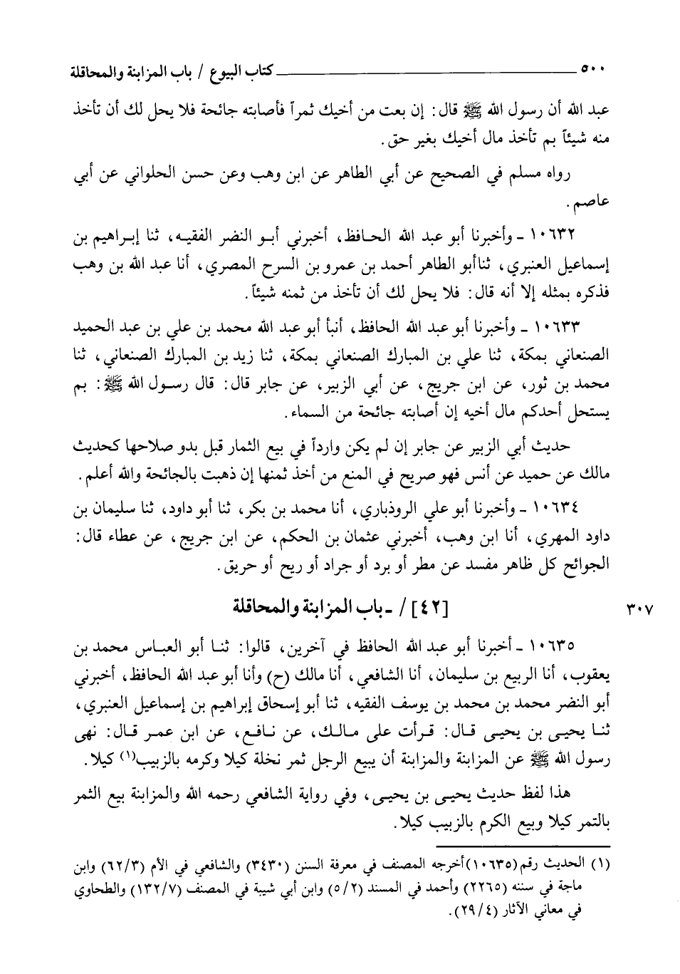 10635 - أَخْبَرَنَا أَبُو عَبْدِ اللهِ الْحَافِظُ فِي آخَرِينَ , قَالُوا: ثنا أَبُو الْعَبَّاسِ مُحَمَّدُ بْنُ يَعْقُوبَ , أنا الرَّبِيعُ بْنُ سُلَيْمَانَ , أنا الشَّافِعِيُّ , أنا مَالِكٌ , ح وَأنا أَبُو عَبْدِ اللهِ الْحَافِظُ , أَخْبَرَنِي أَبُو النَّضْرِ مُحَمَّدُ بْنُ مُحَمَّدِ بْنِ يُوسُفَ الْفَقِيهُ , ثنا أَبُو إِسْحَاقَ إِبْرَاهِيمُ بْنُ إِسْمَاعِيلَ الْعَنْبَرِيُّ , ثنا يَحْيَى بْنُ يَحْيَى , قَالَ: قَرَأْتُ عَلَى مَالِكٍ , عَنْ نَافِعٍ , عَنِ ابْنِ عُمَرَ , قَالَ: §" نَهَى رَسُولُ اللهِ صَلَّى اللهُ عَلَيْهِ وَسَلَّمَ عَنِ الْمُزَابَنَةِ , وَالْمُزَابَنَةُ أَنْ يَبِيعَ الرَّجُلُ ثَمَرَ نَخْلِهِ كَيْلًا , وَكَرْمَهُ بِالزَّبِيبِ كَيْلًا " هَذَا لَفْظُ حَدِيثِ يَحْيَى بْنِ يَحْيَى , وَفِي رِوَايَةِ الشَّافِعِيِّ رَحِمَهُ اللهُ: " وَالْمُزَابَنَةُ بَيْعُ الثَّمَرِ بِالتَّمْرِ كَيْلًا , وَبَيْعُ الْكَرْمِ بِالزَّبِيبِ كَيْلًا " , -[501]- رَوَاهُ الْبُخَارِيُّ فِي الصَّحِيحِ عَنْ عَبْدِ اللهِ بْنِ يُوسُفَ , عَنْ مَالِكٍ , وَرَوَاهُ مُسْلِمٌ عَنْ يَحْيَى بْنِ يَحْيَى عَلَى لَفْظِ حَدِيثِ الشَّافِعِيِّ