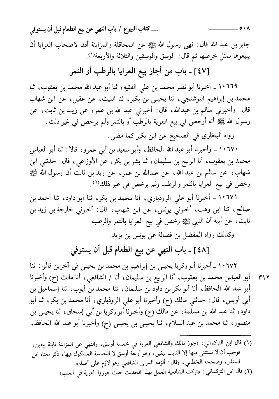 10672 - أَخْبَرَنَا أَبُو زَكَرِيَّا يَحْيَى بْنُ إِبْرَاهِيمَ بْنِ مُحَمَّدِ بْنِ يَحْيَى فِي آخَرِينَ قَالُوا: ثنا أَبُو الْعَبَّاسِ مُحَمَّدُ بْنُ يَعْقُوبَ , أنا الرَّبِيعُ بْنُ سُلَيْمَانَ , أنا الشَّافِعِيُّ , أنا مَالِكٌ , ح وَأَخْبَرَنَا أَبُو عَبْدِ اللهِ الْحَافِظُ , أنا أَبُو بَكْرِ بْنُ دَاوُدَ بْنِ سُلَيْمَانَ , ثنا مُحَمَّدُ بْنُ أَيُّوبَ , ثنا إِسْمَاعِيلُ بْنُ أَبِي أُوَيْسٍ , قَالَ: حَدَّثَنِي مَالِكٌ , ح وَأَخْبَرَنَا أَبُو عَلِيٍّ الرُّوذْبَارِيُّ , أنا مُحَمَّدُ بْنُ بَكْرٍ , ثنا أَبُو دَاوُدَ , ثنا عَبْدُ اللهِ بْنُ مَسْلَمَةَ , عَنْ مَالِكٍ , ح وَأَخْبَرَنَا أَبُو زَكَرِيَّا بْنُ أَبِي إِسْحَاقَ , ثنا يَحْيَى بْنُ مَنْصُورٍ , ثنا مُحَمَّدُ بْنُ عَبْدِ السَّلَامِ , ثنا يَحْيَى بْنُ يَحْيَى , ح وَأَخْبَرَنَا أَبُو عَبْدِ اللهِ الْحَافِظُ , -[509]- ثنا عَلِيُّ بْنُ عِيسَى , ثنا مُحَمَّدُ بْنُ عَمْرٍو الْحَرَشِيُّ , وَإِبْرَاهِيمُ بْنُ عَلِيٍّ , وَمُوسَى بْنُ مُحَمَّدٍ , قَالُوا: ثنا يَحْيَى بْنُ يَحْيَى , قَالَ: قَرَأْتُ عَلَى مَالِكٍ , عَنْ نَافِعٍ , عَنِ ابْنِ عُمَرَ " أَنَّ رَسُولَ اللهِ صَلَّى اللهُ عَلَيْهِ وَسَلَّمَ , قَالَ: §" مَنِ ابْتَاعَ طَعَامًا فَلَا يَبِعْهُ حَتَّى يَسْتَوْفِيَهُ " رَوَاهُ الْبُخَارِيُّ فِي الصَّحِيحِ عَنْ عَبْدِ اللهِ الْقَعْنَبِيِّ , رَوَاهُ مُسْلِمٌ عَنِ الْقَعْنَبِيِّ وَيَحْيَى بْنِ يَحْيَى , قَالَ الْبُخَارِيُّ: زَادَ إِسْمَاعِيلُ " مَنِ ابْتَاعَ طَعَامًا فَلَا يَبِعْهُ حَتَّى يَقْبِضَهُ "