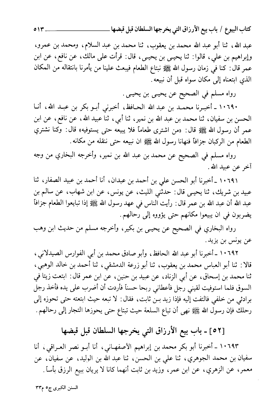 10690 - أَخْبَرَنَا مُحَمَّدُ بْنُ عَبْدِ اللهِ الْحَافِظُ , أَخْبَرَنِي أَبُو بَكْرِ بْنُ عَبْدِ اللهِ , أنا الْحَسَنُ بْنُ سُفْيَانَ , ثنا مُحَمَّدُ بْنُ عَبْدِ اللهِ بْنِ نُمَيْرٍ , ثنا أَبِي , ثنا عُبَيْدُ اللهِ , عَنْ نَافِعٍ , عَنِ ابْنِ عُمَرَ أَنَّ رَسُولَ اللهِ صَلَّى اللهُ عَلَيْهِ وَسَلَّمَ , قَالَ: " §مَنِ اشْتَرَى طَعَامًا فَلَا يَبِعْهُ حَتَّى يَسْتَوْفِيَهُ " قَالَ: وَكُنَّا نَشْتَرِي الطَّعَامَ مِنَ الرُّكْبَانِ جُزَافًا فَنَهَانَا رَسُولُ اللهِ صَلَّى اللهُ عَلَيْهِ وَسَلَّمَ أَنْ نَبِيعَهُ حَتَّى نَنْقُلَهُ مِنْ مَكَانِهِ رَوَاهُ مُسْلِمٌ فِي الصَّحِيحِ عَنْ مُحَمَّدِ بْنِ عَبْدِ اللهِ بْنِ نُمَيْرٍ , وَأَخْرَجَهُ الْبُخَارِيُّ مِنْ وَجْهٍ آخَرَ عَنْ عُبَيْدِ اللهِ