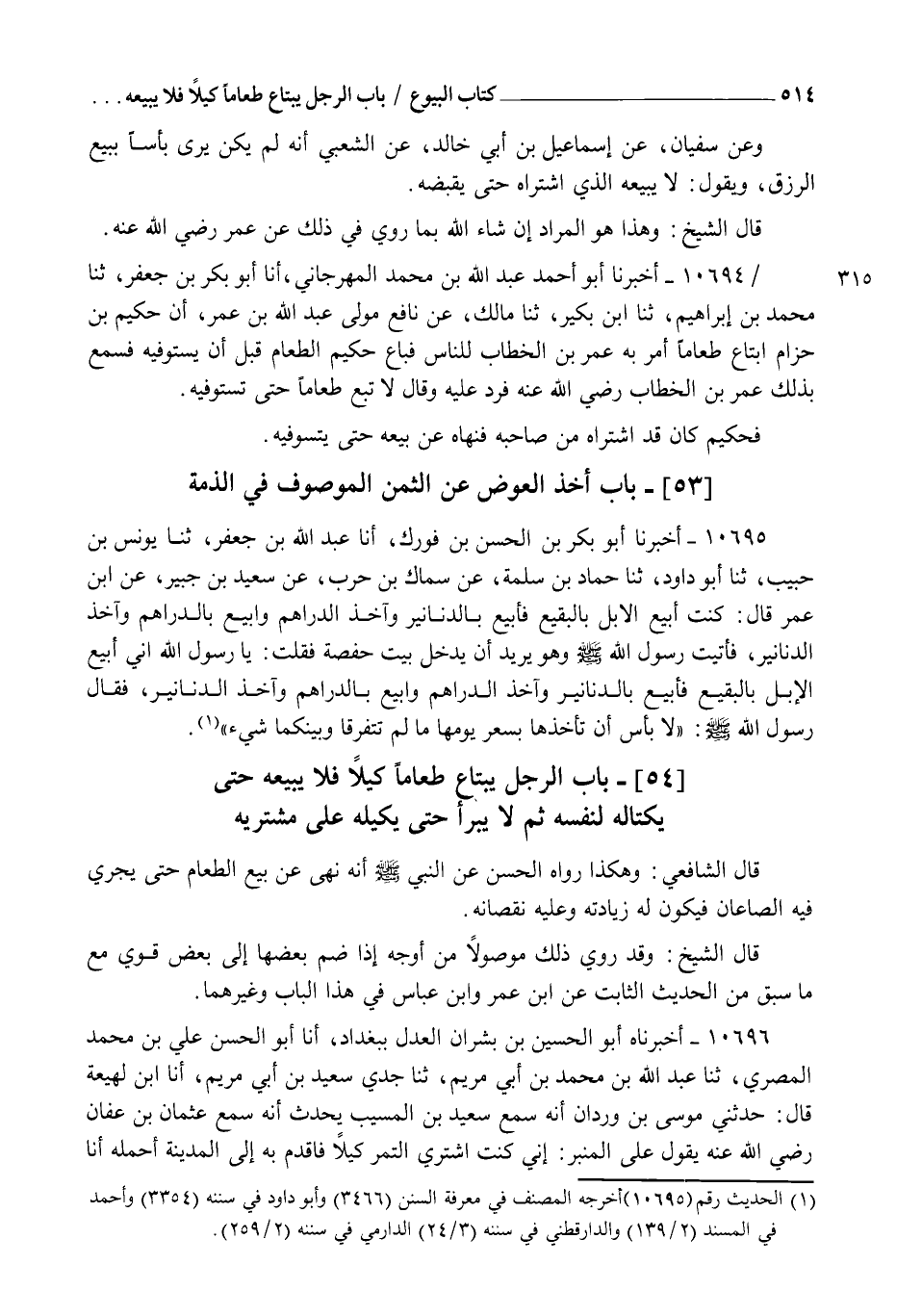 10694 - أَخْبَرَنَا أَبُو أَحْمَدَ عَبْدُ اللهِ بْنُ مُحَمَّدٍ الْمِهْرَجَانِيُّ , أنا أَبُو بَكْرِ بْنُ جَعْفَرٍ , ثنا مُحَمَّدُ بْنُ إِبْرَاهِيمَ , ثنا ابْنُ بُكَيْرٍ , ثنا مَالِكٌ , عَنْ نَافِعٍ مَوْلَى عَبْدِ اللهِ بْنِ عُمَرَ أَنَّ حَكِيمَ بْنَ حِزَامٍ ابْتَاعَ طَعَامًا أَمَرَ بِهِ عُمَرُ بْنُ الْخَطَّابِ لِلنَّاسِ فَبَاعَ حَكِيمٌ الطَّعَامَ قَبْلَ أَنْ يَسْتَوْفِيَهُ فَسَمِعَ بِذَلِكَ عُمَرُ بْنُ الْخَطَّابِ رَضِيَ اللهُ عَنْهُ فَرَدَّ عَلَيْهِ وَقَالَ §" لَا تَبِعْ طَعَامًا مَا ابْتَعْتَهُ حَتَّى تَسْتَوْفِيَهُ " فَحَكِيمٌ كَانَ قَدِ اشْتَرَاهُ مِنْ صَاحِبِهِ فَنَهَاهُ عَنْ بَيْعِهِ حَتَّى يَسْتَوْفِيَهُ