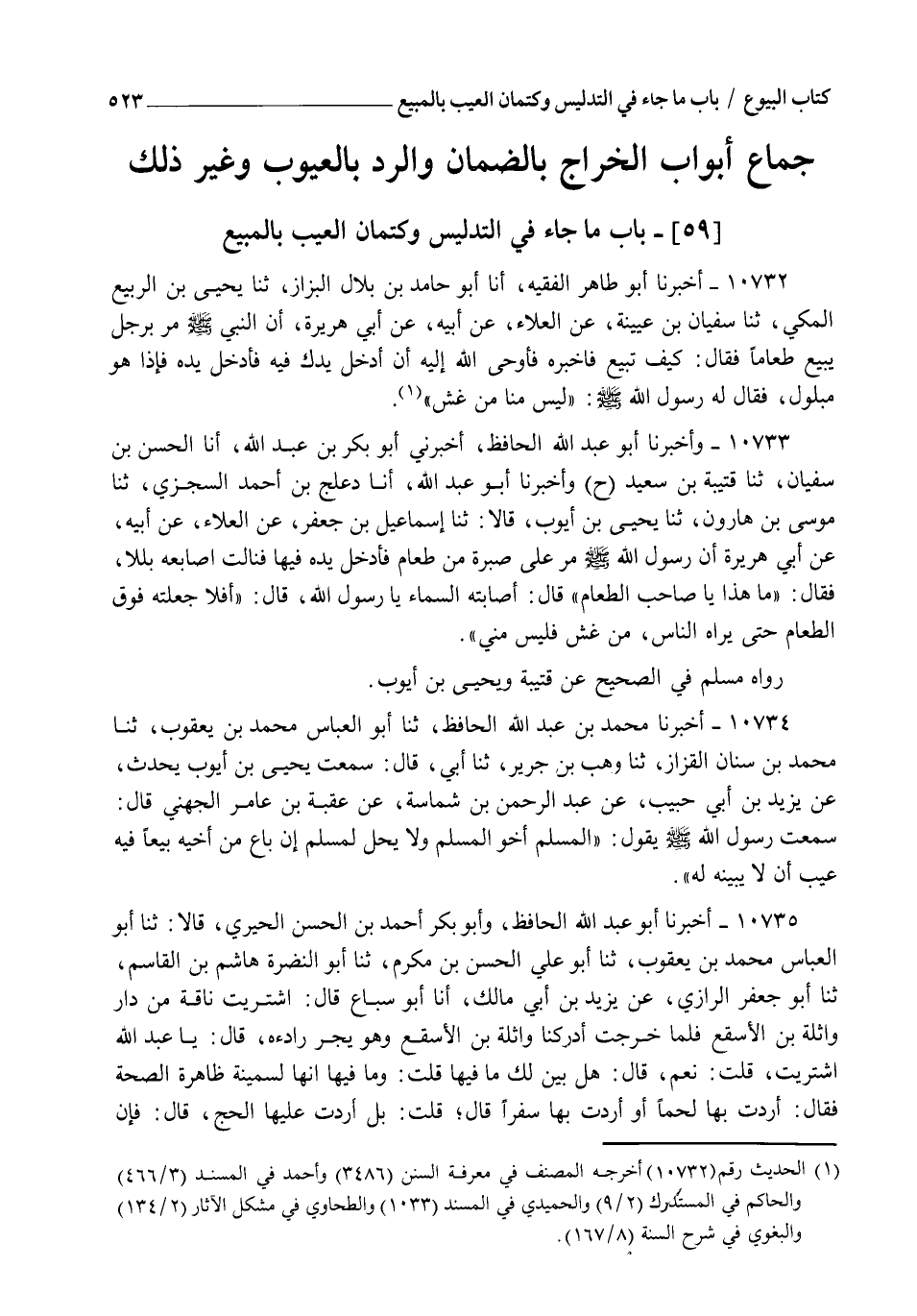 10734 - أَخْبَرَنَا مُحَمَّدُ بْنُ عَبْدِ اللهِ الْحَافِظُ , ثنا أَبُو الْعَبَّاسِ مُحَمَّدُ بْنُ يَعْقُوبَ , ثنا مُحَمَّدُ بْنُ سِنَانٍ الْقَزَّازُ , ثنا وَهْبُ بْنُ جَرِيرٍ , ثنا أَبِي , قَالَ: سَمِعْتُ يَحْيَى بْنَ أَيُّوبَ , يُحَدِّثُ عَنْ يَزِيدَ بْنِ أَبِي حَبِيبٍ , عَنْ عَبْدِ الرَّحْمَنِ بْنِ شِمَاسَةَ , عَنْ عُقْبَةَ بْنِ عَامِرٍ الْجُهَنِيِّ , قَالَ: سَمِعْتُ رَسُولَ اللهِ صَلَّى اللهُ عَلَيْهِ وَسَلَّمَ , يَقُولُ: §" الْمُسْلِمُ أَخُو الْمُسْلِمِ , وَلَا يَحِلُّ لِمُسْلِمٍ إِنْ بَاعَ مِنْ أَخِيهِ بَيْعًا فِيهِ عَيْبٌ أَنْ لَا يُبَيِّنَهُ لَهُ "