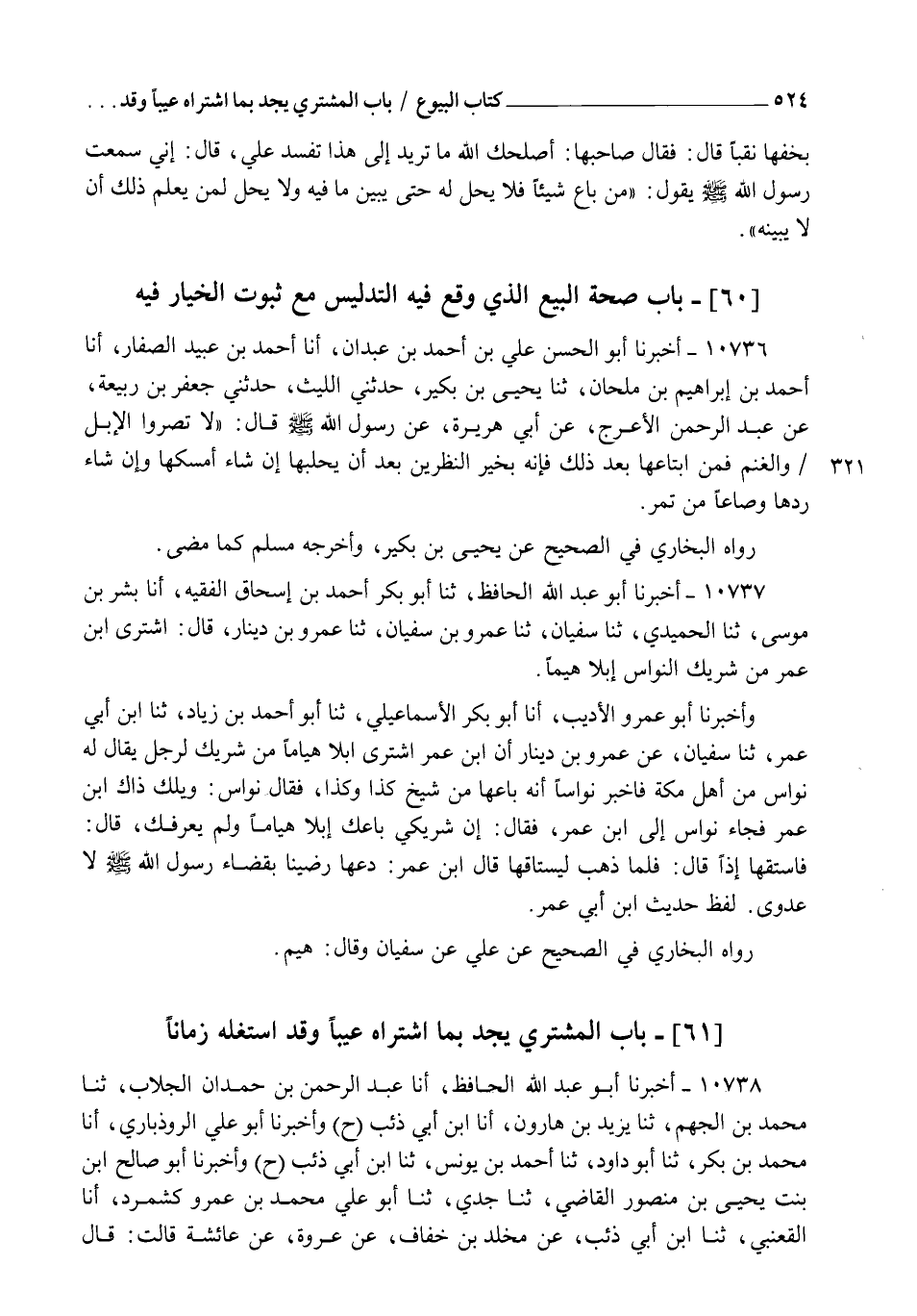 10736 - أَخْبَرَنَا أَبُو الْحَسَنِ عَلِيُّ بْنُ أَحْمَدَ بْنِ عَبْدَانَ , أنا أَحْمَدُ بْنُ عُبَيْدٍ الصَّفَّارُ , أنا أَحْمَدُ بْنُ إِبْرَاهِيمَ بْنِ مِلْحَانَ , ثنا يَحْيَى بْنُ بُكَيْرٍ , حَدَّثَنِي اللَّيْثُ , حَدَّثَنِي جَعْفَرُ بْنُ رَبِيعَةَ , عَنْ عَبْدِ الرَّحْمَنِ الْأَعْرَجِ , عَنْ أَبِي هُرَيْرَةَ , عَنْ رَسُولِ اللهِ صَلَّى اللهُ عَلَيْهِ وَسَلَّمَ , قَالَ: §" لَا تُصَرُّوا الْإِبِلَ , وَالْغَنَمَ فَمَنِ ابْتَاعَهَا بَعْدَ ذَلِكَ فَإِنَّهُ بِخَيْرِ النَّظَرَيْنِ بَعْدَ أَنْ يَحْلُبَهَا , إِنْ شَاءَ أَمْسَكَهَا , وَإِنْ شَاءَ رَدَّهَا وَصَاعًا مِنْ تَمْرٍ " , رَوَاهُ الْبُخَارِيُّ فِي الصَّحِيحِ عَنْ يَحْيَى بْنِ بُكَيْرٍ , وَأَخْرَجَهُ مُسْلِمٌ كَمَا مَضَى