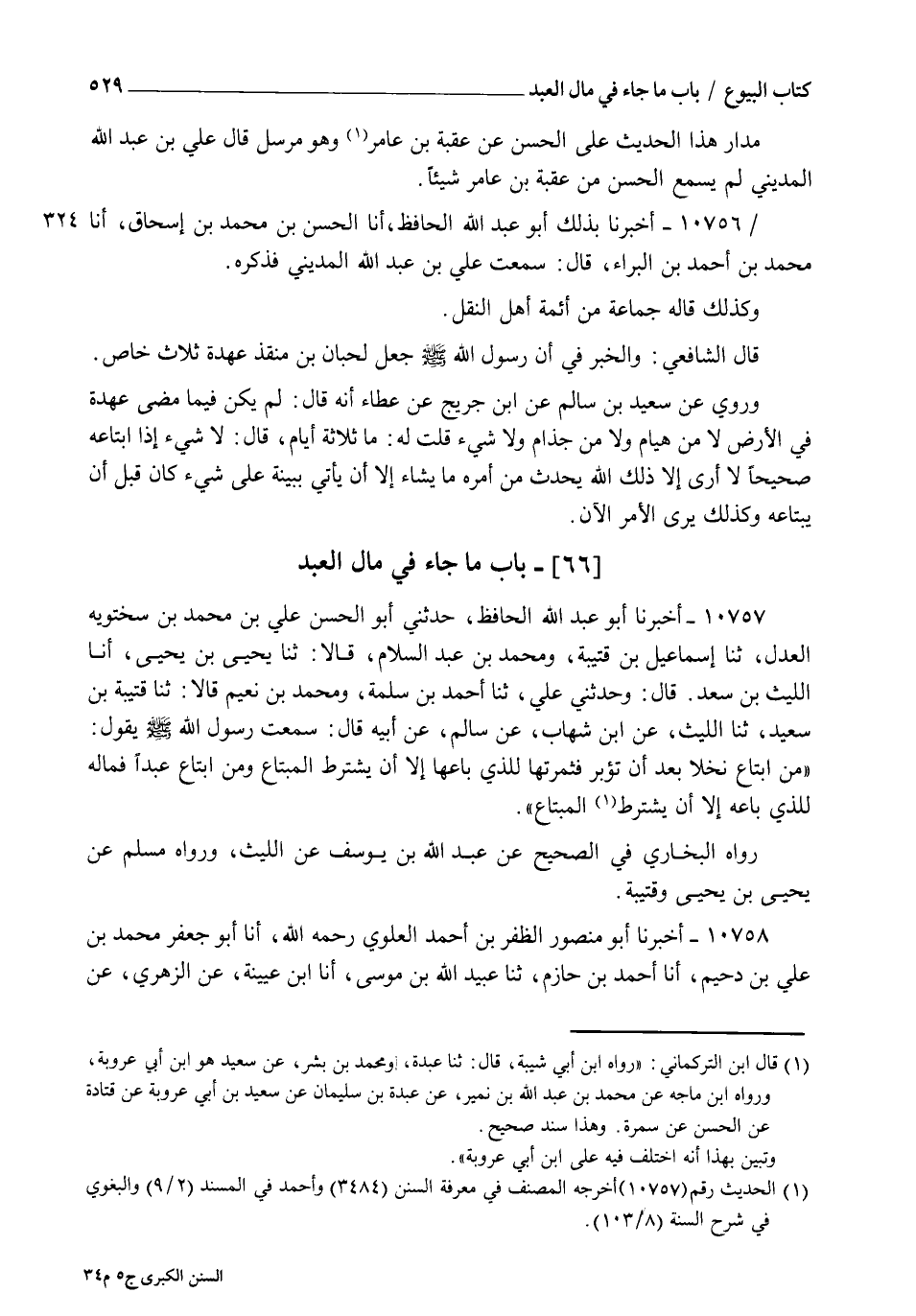 10759 - وَأَخْبَرَنَا أَبُو عَبْدِ اللهِ الْحَافِظُ , حَدَّثَنِي عَلِيُّ بْنُ مُحَمَّدِ بْنِ سَخْتَوَيْهِ , ثنا إِسْمَاعِيلُ بْنُ قُتَيْبَةَ , وَمُحَمَّدُ بْنُ عَبْدِ السَّلَامِ , قَالَا: ثنا يَحْيَى بْنُ يَحْيَى , أنا سُفْيَانُ , فَذَكَرَهُ. رَوَاهُ مُسْلِمٌ فِي الصَّحِيحِ عَنْ يَحْيَى بْنِ يَحْيَى , وَغَيْرِهِ , هَكَذَا رَوَاهُ سَالِمُ بْنُ عَبْدِ اللهِ , عَنْ أَبِيهِ , عَنِ النَّبِيِّ صَلَّى اللهُ عَلَيْهِ وَسَلَّمَ قِصَّةَ النَّخْلِ وَالْعَبْدِ جَمِيعًا , وَخَالَفَهُ نَافِعٌ فَرَوَى قِصَّةَ النَّخْلِ عَنِ ابْنِ عُمَرَ , عَنِ النَّبِيِّ صَلَّى اللهُ عَلَيْهِ وَسَلَّمَ , وَقِصَّةَ الْعَبْدِ عَنِ ابْنِ عُمَرَ , عَنْ عُمَرَ رَضِيَ اللهُ عَنْهُ