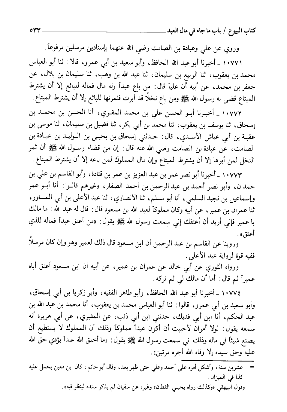 10773 - أَخْبَرَنَا أَبُو نَصْرٍ عُمَرُ بْنُ عَبْدِ الْعَزِيزِ بْنِ عُمَرَ بْنِ قَتَادَةَ , وَأَبُو الْقَاسِمِ عَبْدُ الرَّحْمَنِ بْنُ عَلِيِّ بْنِ حَمْدَانَ , وَأَبُو نَصْرٍ أَحْمَدُ بْنُ عَبْدِ الرَّحْمَنِ بْنِ أَحْمَدَ الصَّفَّارُ وَغَيْرُهُمْ , قَالُوا: أنا أَبُو عَمْرٍو إِسْمَاعِيلُ بْنُ نُجَيْدٍ السُّلَمِيُّ , أنا أَبُو مُسْلِمٍ , ثنا الْأَنْصَارِيُّ , ثنا عَبْدُ الْأَعْلَى بْنُ أَبِي الْمُسَاوِرِ , ثنا عِمْرَانُ بْنُ عُمَيْرٍ , عَنْ أَبِيهِ , وَكَانَ مَمْلُوكًا لِعَبْدِ اللهِ بْنِ مَسْعُودٍ , قَالَ: قَالَ لَهُ عَبْدُ اللهِ: مَا مَالُكَ يَا عُمَيْرُ فَإِنِّي أُرِيدُ أَنْ أُعْتِقَكَ؟ إِنِّي سَمِعْتُ رَسُولَ اللهِ صَلَّى اللهُ عَلَيْهِ وَسَلَّمَ , يَقُولُ: §" مَنْ أَعْتَقَ عَبْدًا فَمَالُهُ لِلَّذِي أَعْتَقَ " وَرُوِّينَا عَنِ الْقَاسِمِ بْنِ عَبْدِ الرَّحْمَنِ أَنَّ ابْنَ مَسْعُودٍ , قَالَ: ذَلِكَ لِعُمَيْرٍ وَهُوَ وَإِنْ كَانَ مُرْسَلًا فَفِيهِ قُوَّةٌ لِرِوَايَةِ عَبْدِ الْأَعْلَى , وَرَوَاهُ الثَّوْرِيُّ عَنْ أَبِي خَالِدٍ , عَنْ عِمْرَانَ بْنِ عُمَيْرٍ , عَنْ أَبِيهِ أَنَّ ابْنَ مَسْعُودٍ أَعْتَقَ أَبَاهُ عُمَيْرًا ثُمَّ قَالَ: " أَمَا إنَّ مَالَكَ لِي ثُمَّ تَرَكَهُ "