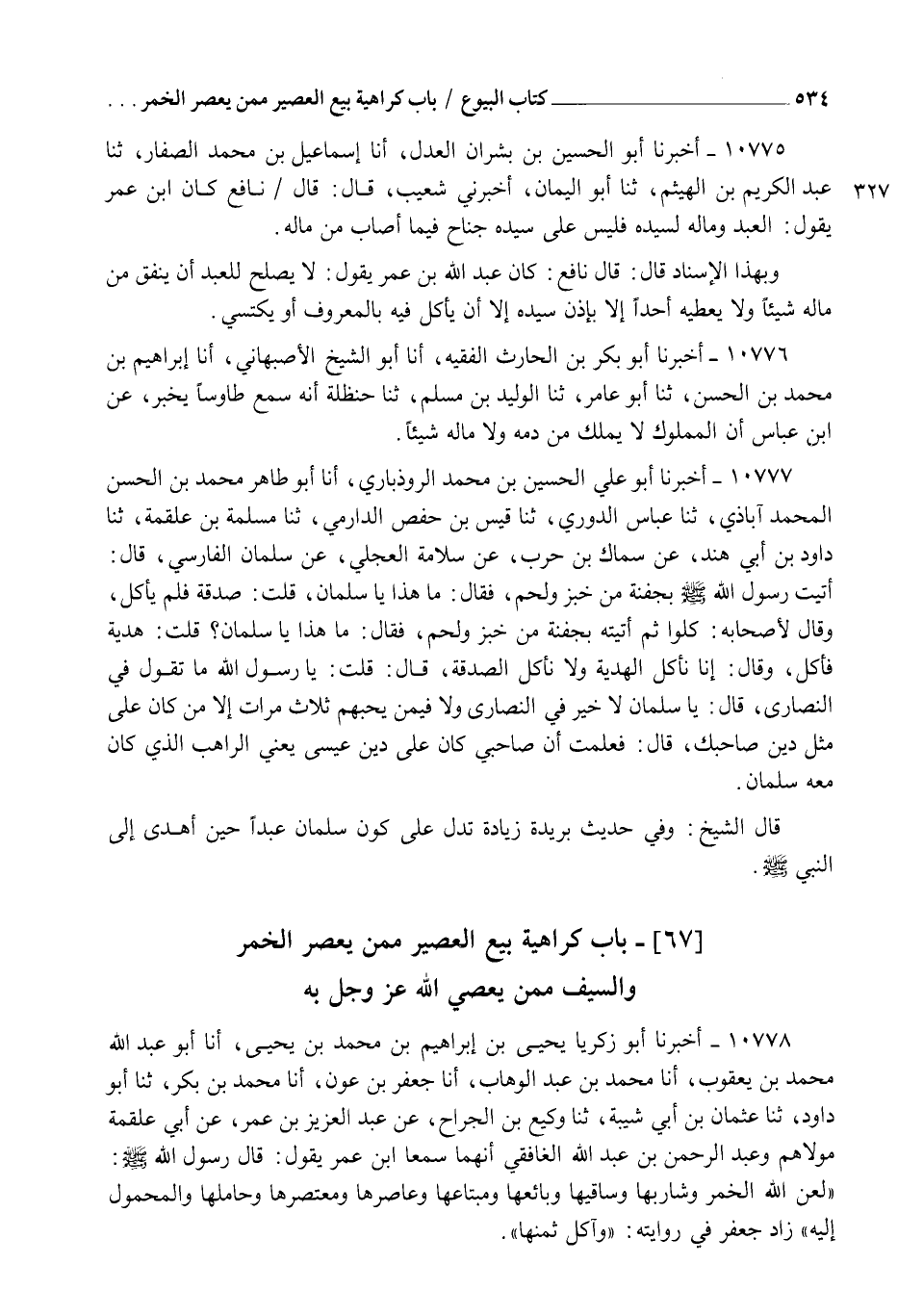 10778 - أَخْبَرَنَا أَبُو زَكَرِيَّا يَحْيَى بْنُ إِبْرَاهِيمَ بْنِ مُحَمَّدِ بْنِ يَحْيَى , أنا أَبُو عَبْدِ اللهِ مُحَمَّدُ بْنُ يَعْقُوبَ , أنا مُحَمَّدُ بْنُ عَبْدِ الْوَهَّابِ , أنا جَعْفَرُ بْنُ عَوْنٍ، أنا عَبْدُ الْعَزِيزِ بْنُ عُمَرَ بْنِ عَبْدِ الْعَزِيزِ، ثنا عَبْدُ الرَّحْمَنِ بْنُ عَبْدِ اللهِ، وَرَجُلٌ مِنْ مَوَالِينَا، ح وَأَخْبَرَنَا أَبُو عَلِيٍّ الرُّوذْبَارِيُّ، أنا مُحَمَّدُ بْنُ بَكْرٍ، ثنا أَبُو دَاوُدَ , ثنا عُثْمَانُ بْنُ أَبِي شَيْبَةَ , ثنا وَكِيعُ بْنُ الْجَرَّاحِ , عَنْ عَبْدِ الْعَزِيزِ بْنِ عُمَرَ , عَنْ أَبِي عَلْقَمَةَ , مَوْلَاهُمْ وَعَبْدِ الرَّحْمَنِ بْنِ عَبْدِ اللهِ الْغَافِقِيِّ أَنَّهُمَا سَمِعَا ابْنَ عُمَرَ , يَقُولُ: قَالَ رَسُولُ اللهِ صَلَّى اللهُ عَلَيْهِ وَسَلَّمَ: §" لَعَنَ اللهُ الْخَمْرَ وَشَارِبَهَا , وَسَاقِيَهَا , وَبَائِعَهَا , وَمُبْتَاعَهَا , وَعَاصِرَهَا , وَمُعْتَصِرَهَا , وَحَامِلَهَا , وَالْمَحْمُولَ إِلَيْهِ " - زَادَ جَعْفَرٌ فِي رِوَايَتِهِ - " وَآكِلَ ثَمَنِهَا "