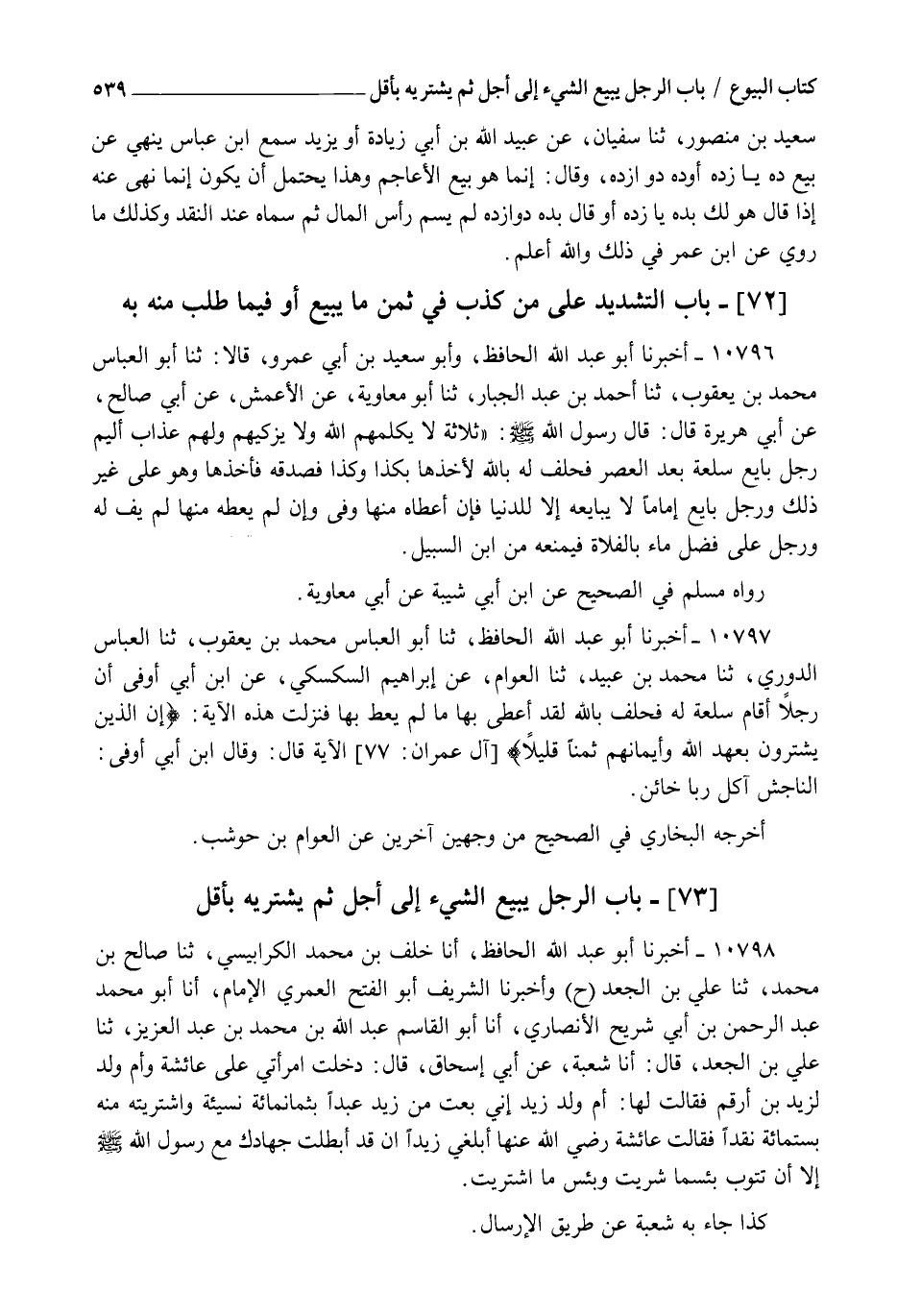 10797 - أَخْبَرَنَا أَبُو عَبْدِ اللهِ الْحَافِظُ , ثنا أَبُو الْعَبَّاسِ مُحَمَّدُ بْنُ يَعْقُوبَ , ثنا الْعَبَّاسُ الدُّورِيُّ , ثنا مُحَمَّدُ بْنُ عُبَيْدٍ , ثنا الْعَوَّامُّ , عَنْ إِبْرَاهِيمَ السَّكْسَكِيِّ , عَنِ ابْنِ أَبِي أَوْفَى أَنَّ رَجُلًا أَقَامَ سِلْعَةً لَهُ فَحَلَفَ بِاللهِ لَقَدْ أَعْطَى بِهَا مَا لَمْ يُعْطِ بِهَا فَنَزَلَتْ هَذِهِ الْآيَةُ {إِنَّ الَّذِينَ يَشْتَرُونَ بِعَهْدِ اللهِ وَأَيْمَانِهِمْ ثَمَنًا قَلِيلًا} [آل عمران: 77] الْآيَةَ , قَالَ: §وَقَالَ ابْنُ أَبِي أَوْفَى: النَّاجِشُ آكِلُ رِبًا خَائِنٌ , أَخْرَجَهُ الْبُخَارِيُّ فِي الصَّحِيحِ مِنْ وَجْهَيْنِ آخَرَيْنِ عَنِ الْعَوَّامِّ بْنِ حَوْشَبٍ