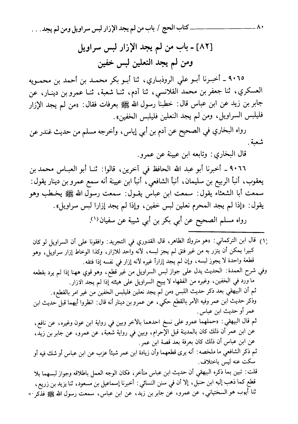 9065 - أَخْبَرَنَا أَبُو عَلِيٍّ الرُّوذْبَارِيُّ , ثنا أَبُو بَكْرٍ مُحَمَّدُ بْنُ أَحْمَدَ بْنِ مَحْمَوَيْهِ الْعَسْكَرِيُّ , ثنا جَعْفَرُ بْنُ مُحَمَّدٍ الْقَلَانِسِيُّ , ثنا آدَمُ , ثنا شُعْبَةُ , ثنا عَمْرُو بْنُ دِينَارٍ , عَنْ جَابِرِ بْنِ زَيْدٍ , عَنِ ابْنِ عَبَّاسٍ , قَالَ: خَطَبَنَا رَسُولُ اللهِ صَلَّى اللهُ عَلَيْهِ وَسَلَّمَ بِعَرَفَاتٍ فَقَالَ: §" مَنْ لَمْ يَجِدِ الْإِزَارَ فَلْيَلْبَسِ السَّرَاوِيلَ , وَمَنْ لَمْ يَجِدِ النَّعْلَيْنِ فَلْيَلْبَسِ الْخُفَّيْنِ " رَوَاهُ الْبُخَارِيُّ فِي الصَّحِيحِ عَنْ آدَمَ بْنِ أَبِي إِيَاسٍ , وَأَخْرَجَهُ مُسْلِمٌ مِنْ حَدِيثِ غُنْدَرٍ عَنْ شُعْبَةَ , قَالَ الْبُخَارِيُّ: وَتَابَعَهُ ابْنُ عُيَيْنَةَ عَنْ عَمْرٍو