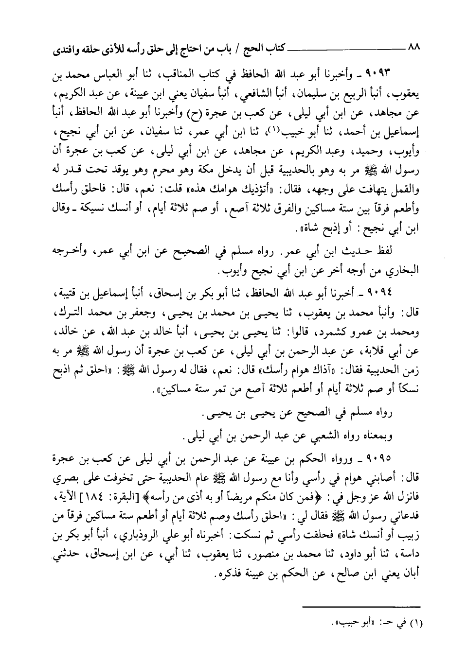 9094 - أَخْبَرَنَا أَبُو عَبْدِ اللهِ الْحَافِظُ , ثنا أَبُو بَكْرِ بْنُ إِسْحَاقَ , أنبأ إِسْمَاعِيلُ بْنُ قُتَيْبَةَ , قَالَ: وَأنبأ مُحَمَّدُ بْنُ يَعْقُوبَ , ثنا يَحْيَى بْنُ مُحَمَّدِ بْنِ يَحْيَى , وَجَعْفَرُ بْنُ مُحَمَّدٍ التُّرْكُ , وَمُحَمَّدُ بْنُ عَمْرٍو كَشْمَرْدُ قَالُوا: ثنا يَحْيَى بْنُ يَحْيَى , أنبأ خَالِدُ بْنُ عَبْدِ اللهِ , عَنْ خَالِدٍ , عَنْ أَبِي قِلَابَةَ , عَنْ عَبْدِ الرَّحْمَنِ بْنِ أَبِي لَيْلَى , عَنْ كَعْبِ بْنِ عُجْرَةَ أَنَّ رَسُولَ اللهِ صَلَّى اللهُ عَلَيْهِ وَسَلَّمَ مَرَّ بِهِ زَمَنَ الْحُدَيْبِيَةِ فَقَالَ: " آذَاكَ هَوَامُّ رَأْسِكَ؟ " قَالَ: نَعَمْ , فَقَالَ لَهُ رَسُولُ اللهِ صَلَّى اللهُ عَلَيْهِ وَسَلَّمَ: §" احْلِقْ ثُمَّ اذْبَحْ نُسُكًا , أَوْ صُمْ ثَلَاثَةَ أَيَّامٍ , أَوْ أَطْعِمْ ثَلَاثَةَ آصُعٍ مِنْ تَمْرٍ سِتَّةَ مَسَاكِينَ " رَوَاهُ مُسْلِمٌ فِي الصَّحِيحِ عَنْ يَحْيَى بْنِ يَحْيَى , وَبِمَعْنَاهُ رَوَاهُ الشَّعْبِيُّ عَنْ عَبْدِ الرَّحْمَنِ بْنِ أَبِي لَيْلَى