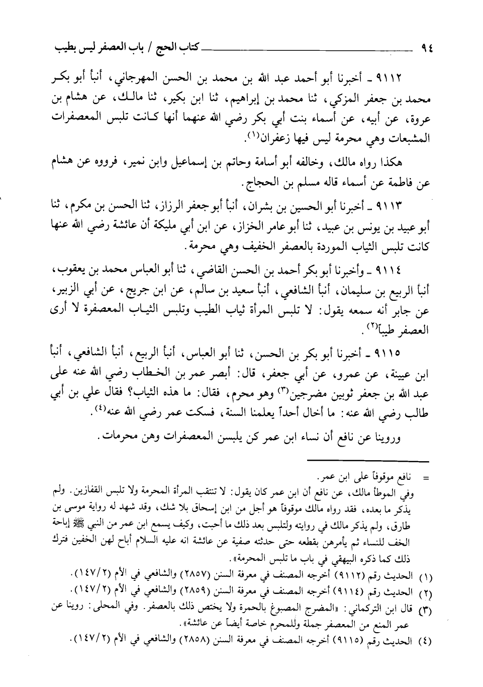 9115 - أَخْبَرَنَا أَبُو بَكْرِ بْنُ الْحَسَنِ , ثنا أَبُو الْعَبَّاسِ , أنبأ الرَّبِيعُ , أنبأ الشَّافِعِيُّ , أنبأ ابْنُ عُيَيْنَةَ , عَنْ عَمْرٍو , عَنْ أَبِي جَعْفَرٍ , قَالَ: أَبْصَرَ عُمَرُ بْنُ الْخَطَّابِ رَضِيَ اللهُ عَنْهُ عَلَى عَبْدِ اللهِ بْنِ جَعْفَرٍ §ثَوْبَيْنِ مُضَرَّجَيْنِ وَهُوَ مُحْرِمٌ فَقَالَ: مَا هَذِهِ الثِّيَابُ؟ فَقَالَ عَلِيُّ بْنُ أَبِي طَالِبٍ رَضِيَ اللهُ عَنْهُ: " مَا أَخَالُ أَحَدًا يُعَلِّمُنَا السُّنَّةَ " , فَسَكَتَ عُمَرُ رَضِيَ اللهُ عَنْهُ وَرُوِّينَا عَنْ نَافِعٍ أَنَّ نِسَاءَ ابْنِ عُمَرَ كُنَّ يَلْبَسْنَ الْمُعَصْفَرَاتِ وَهُنَّ مُحْرِمَاتٌ