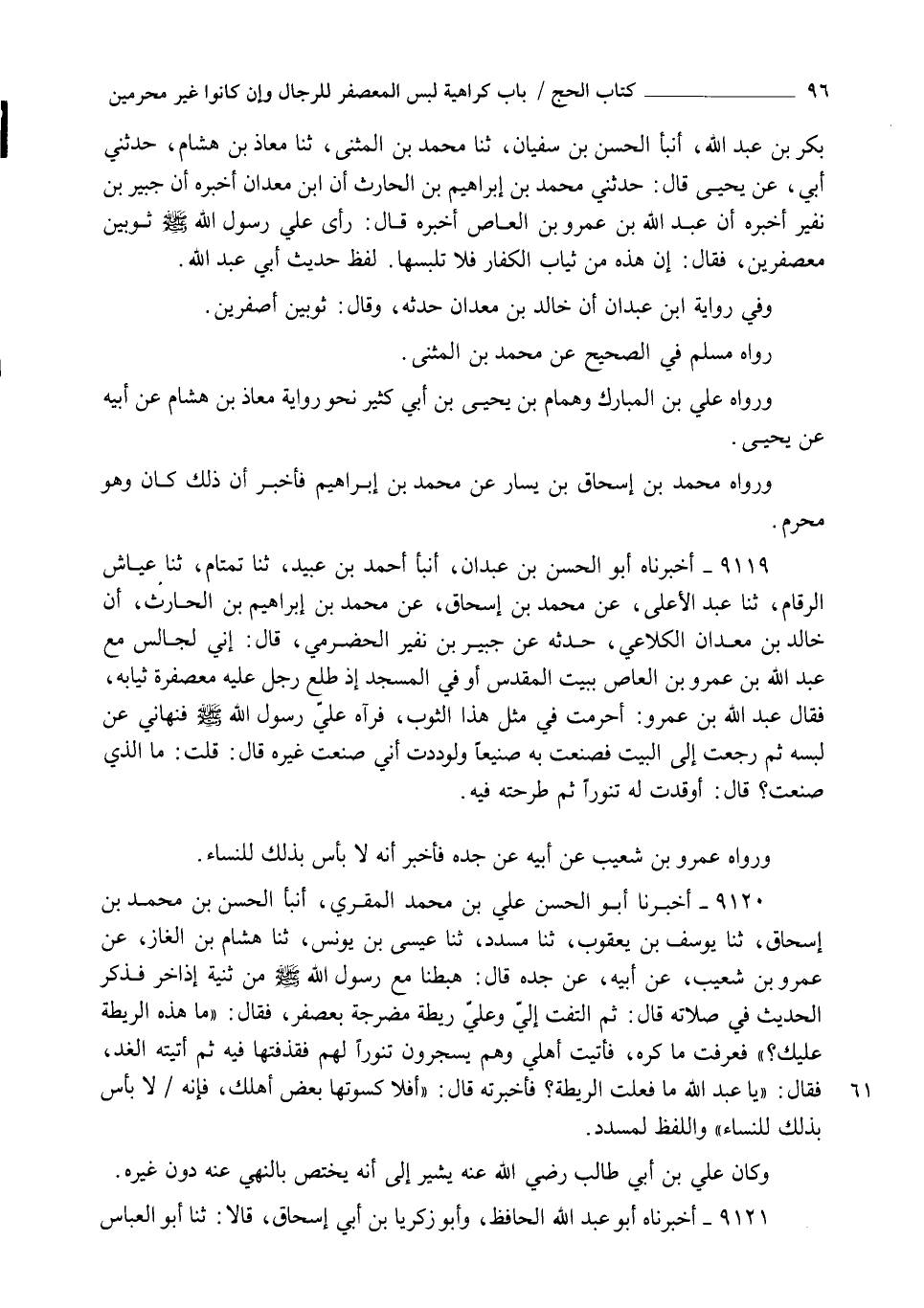 9120 - أَخْبَرَنَا أَبُو الْحَسَنِ عَلِيُّ بْنُ مُحَمَّدٍ الْمُقْرِئُ , أنبأ الْحَسَنُ بْنُ مُحَمَّدِ بْنِ إِسْحَاقَ , ثنا يُوسُفُ بْنُ يَعْقُوبَ , ثنا مُسَدَّدٌ , ثنا عِيسَى بْنُ يُونُسَ , ثنا هِشَامُ بْنُ الْغَازِ , عَنْ عَمْرِو بْنِ شُعَيْبٍ , عَنْ أَبِيهِ , عَنْ جَدِّهِ , قَالَ: هَبَطْنَا مَعَ رَسُولِ اللهِ صَلَّى اللهُ عَلَيْهِ وَسَلَّمَ مِنْ ثَنِيَّةِ إذَاخِرٍ فَذَكَرَ الْحَدِيثَ فِي صَلَاتِهِ , قَالَ: ثُمَّ الْتَفَتَ إِلِيَّ وَعَلَيَّ رَيْطَةٌ مُضَرَّجَةٌ بِعُصْفُرٍ فَقَالَ: " مَا هَذِهِ الرَّيْطَةُ عَلَيْكَ؟ " فَعَرَفْتُ مَا كَرِهَ , فَأَتَيْتُ أَهْلِي وَهُمْ يَسْجُرُونَ تَنُّورًا لَهُمْ فَقَذَفْتُهَا فِيهِ ثُمَّ أَتَيْتُهُ الْغَدَ , فَقَالَ " يَا عَبْدَ اللهِ مَا فَعَلَتِ الرَّيْطَةُ؟ " فَأَخْبَرْتُهُ قَالَ: §" أَفَلَا كَسَوْتَهَا بَعْضَ أَهْلِكَ؟ فَإِنَّهُ لَا بَأْسَ بِذَلِكَ لِلنِّسَاءِ " وَاللَّفْظُ لِمُسَدَّدٍ , وَكَانَ عَلِيُّ بْنُ أَبِي طَالِبٍ رَضِيَ اللهُ عَنْهُ يُشِيرُ إِلَى أَنَّهُ يَخْتَصُّ بِالنَّهْيِ عَنْهُ دُونَ غَيْرِهِ