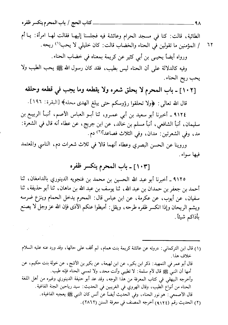 9125 - أَخْبَرَنَا أَبُو عَبْدِ اللهِ الْحُسَيْنُ بْنُ مُحَمَّدِ بْنِ فَنْجَوَيْهِ الدَّيْنَوَرِيُّ , بِالدَّامَغَانِ , ثنا أَحْمَدُ بْنُ جَعْفَرِ بْنِ حَمْدَانَ بْنِ عَبْدِ اللهِ , ثنا يُوسُفُ بْنُ عَبْدِ اللهِ بْنِ مَاهَانَ , ثنا أَبُو حُذَيْفَةَ , ثنا سُفْيَانُ , عَنْ أَيُّوبَ , عَنْ عِكْرِمَةَ , عَنِ ابْنِ عَبَّاسٍ , قَالَ: §" الْمُحْرِمُ يَدْخُلُ الْحَمَّامَ وَيَنْزِعُ ضِرْسَهُ , وَيَشَمُّ الرَّيْحَانَ , وَإِذَا انْكَسَرَ ظُفْرُهُ طَرَحَهُ , وَيَقُولُ: أَمِيطُوا عَنْكُمُ الْأَذَى فَإِنَّ اللهَ عَزَّ وَجَلَّ لَا يَصْنَعُ بِأَذَاكُمْ شَيْئًا "