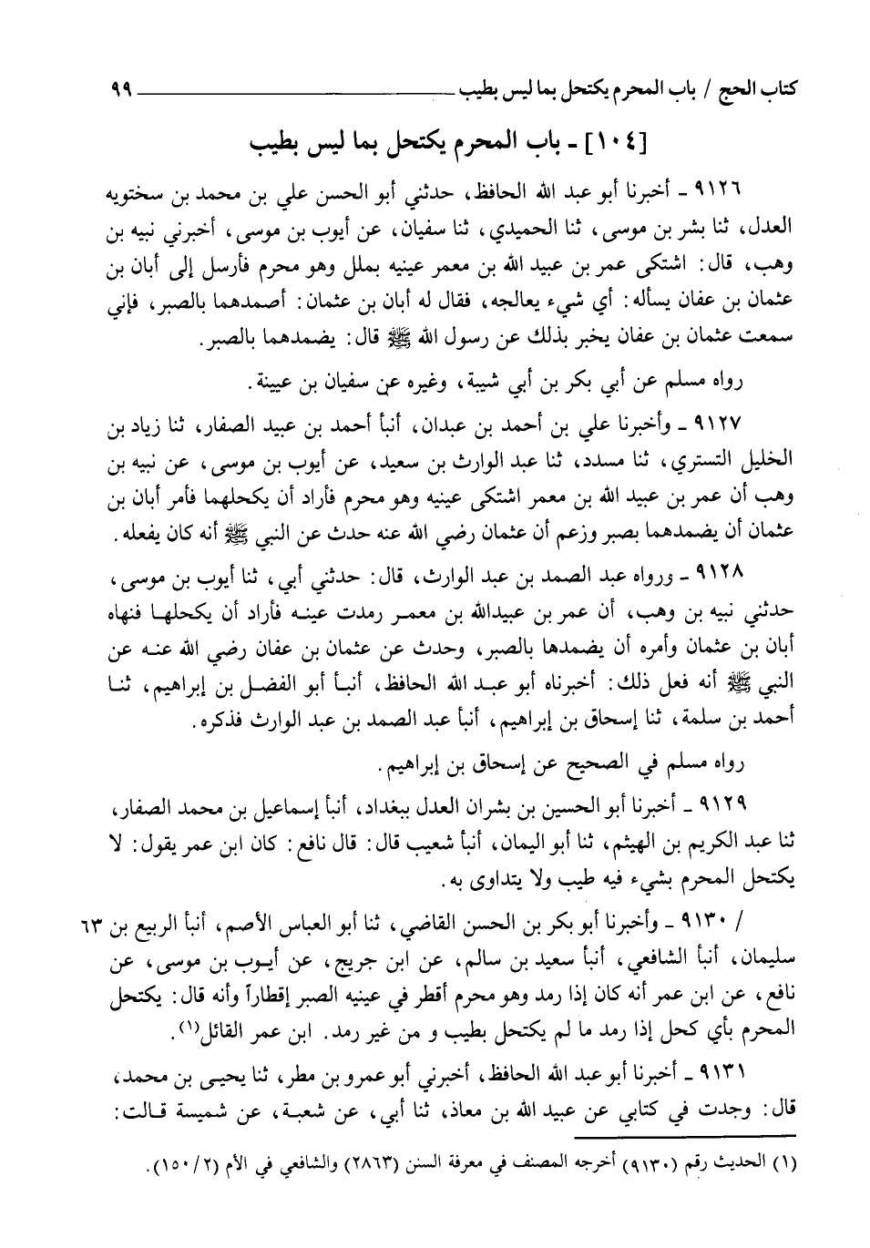 9129 - أَخْبَرَنَا أَبُو الْحُسَيْنِ بْنُ بِشْرَانَ الْعَدْلُ , بِبَغْدَادَ , أنبأ إِسْمَاعِيلُ بْنُ مُحَمَّدٍ الصَّفَّارُ , ثنا عَبْدُ الْكَرِيمِ بْنُ الْهَيْثَمِ , ثنا أَبُو الْيَمَانِ , أنبأ شُعَيْبٌ , قَالَ: قَالَ نَافِعٌ: كَانَ ابْنُ عُمَرَ يَقُولُ: §" لَا يَكْتَحِلُ الْمُحْرِمُ بِشَيْءٍ فِيهِ طِيبٌ وَلَا يَتَدَاوَى بِهِ "
