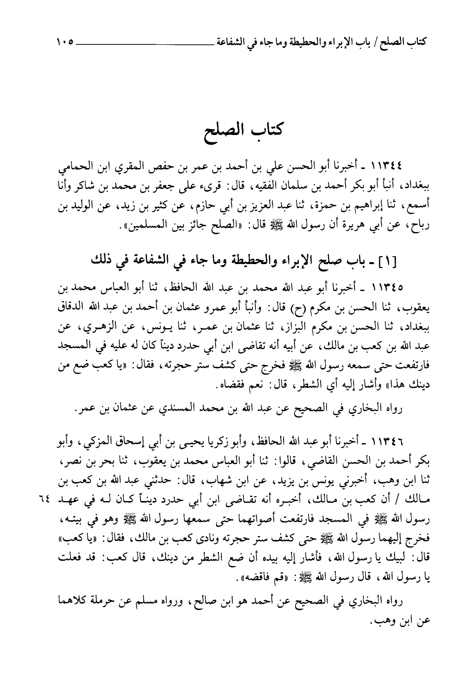 11345 - أَخْبَرَنَا أَبُو عَبْدِ اللهِ مُحَمَّدُ بْنُ عَبْدِ اللهِ الْحَافِظُ , ثنا أَبُو الْعَبَّاسِ مُحَمَّدُ بْنُ يَعْقُوبَ، ثنا الْحَسَنُ بْنُ مُكْرَمٍ، ح قَالَ: وَأنبأ أَبُو عَمْرٍو عُثْمَانُ بْنُ أَحْمَدَ بْنِ عَبْدِ اللهِ الدَّقَّاقُ بِبَغْدَادَ , ثنا الْحَسَنُ بْنُ مُكْرَمٍ الْبَزَّازُ، ثنا عُثْمَانُ بْنُ عُمَرَ، ثنا يُونُسُ، عَنِ الزُّهْرِيِّ، عَنْ عَبْدِ اللهِ بْنِ كَعْبِ بْنِ مَالِكٍ، عَنْ أَبِيهِ أَنَّهُ تَقَاضَى ابْنَ أَبِي حَدْرَدٍ دَيْنًا كَانَ لَهُ عَلَيْهِ فِي الْمَسْجِدِ، فَارْتَفَعَتْ أَصْوَاتُهُمَا حَتَّى سَمِعَهَا رَسُولُ اللهِ صَلَّى اللهُ عَلَيْهِ وَسَلَّمَ، فَخَرَجَ حَتَّى كَشَفَ سِتْرَ حُجْرَتِهِ فَقَالَ: " يَا كَعْبُ، §ضَعْ مِنْ دَيْنِكَ هَذَا " وَأَشَارَ إِلَيْهِ أَيِ الشَّطْرَ، قَالَ: نَعَمْ، فَقَضَاهُ رَوَاهُ الْبُخَارِيُّ فِي الصَّحِيحِ عَنْ عَبْدِ اللهِ بْنِ مُحَمَّدٍ الْمُسْنَدِيِّ، عَنْ عُثْمَانَ بْنِ عُمَرَ