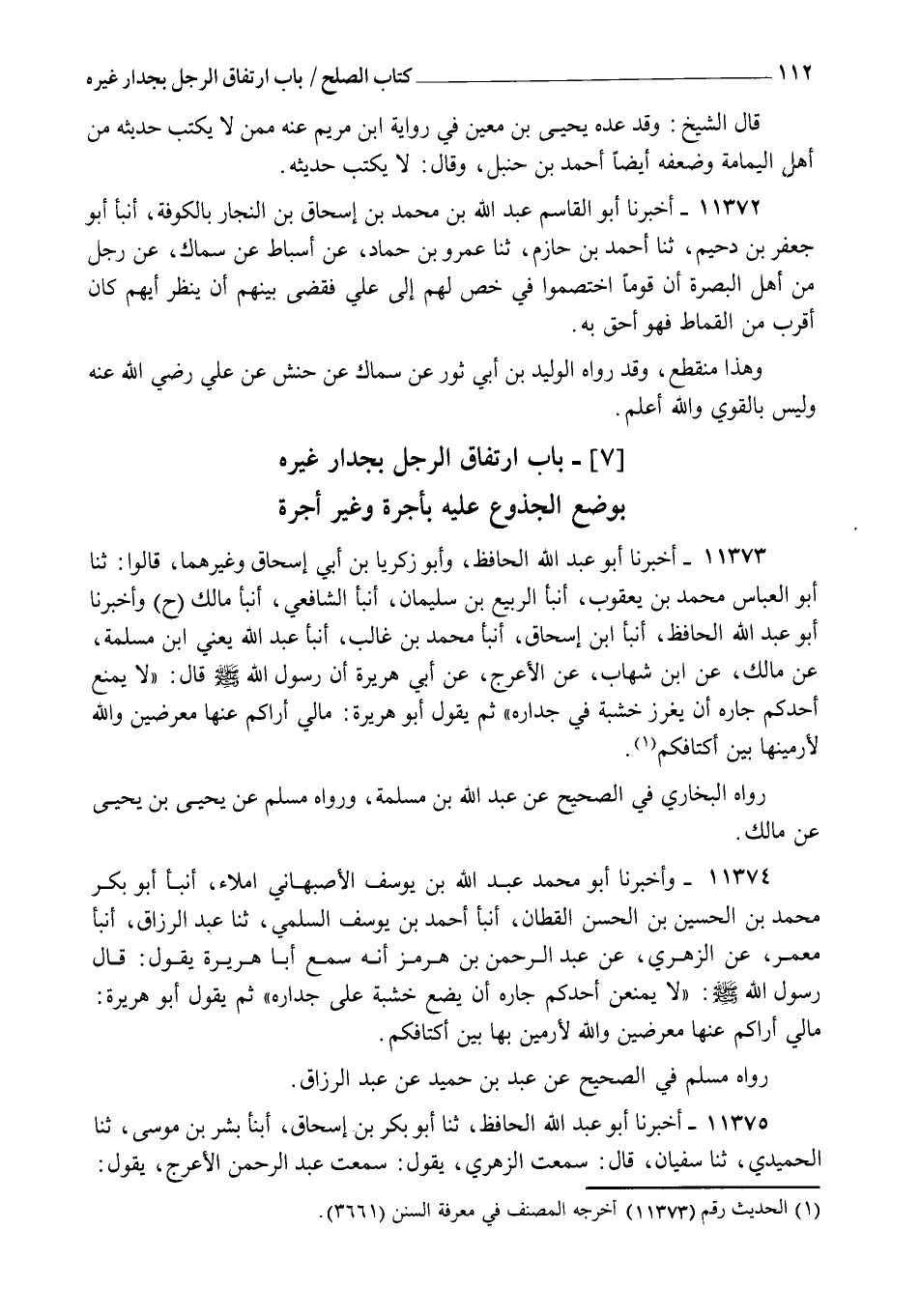 11375 - أَخْبَرَنَا أَبُو عَبْدِ اللهِ الْحَافِظُ، ثنا أَبُو بَكْرِ بْنُ إِسْحَاقَ، أنبأ بِشْرُ بْنُ مُوسَى، ثنا الْحُمَيْدِيُّ، ثنا سُفْيَانُ قَالَ: سَمِعْتُ الزُّهْرِيَّ يَقُولُ: سَمِعْتُ عَبْدَ الرَّحْمَنِ الْأَعْرَجَ يَقُولُ: -[113]- سَمِعْتُ أَبَا هُرَيْرَةَ يَقُولُ: قَالَ رَسُولُ اللهِ صَلَّى اللهُ عَلَيْهِ وَسَلَّمَ: §" إِذَا اسْتَأْذَنَ أَحَدُكُمْ جَارَهُ أَنْ يَغْرِزَ خَشَبَتَهُ فِي جِدَارِهِ فَلَا يَمْنَعْهُ " فَلَمَّا حَدَّثَهُمْ طَأْطَئُوا رُءُوسَهُمْ، فَقَالَ: مَا لِي أَجِدُكُمْ مُعْرِضِينَ؟ وَاللهِ لَأَرْمِيَنَّ بِهَا بَيْنَ أَكْتَافِكُمْ رَوَاهُ مُسْلِمٌ فِي الصَّحِيحِ عَنْ أَبِي خَيْثَمةَ، عَنْ سُفْيَانَ