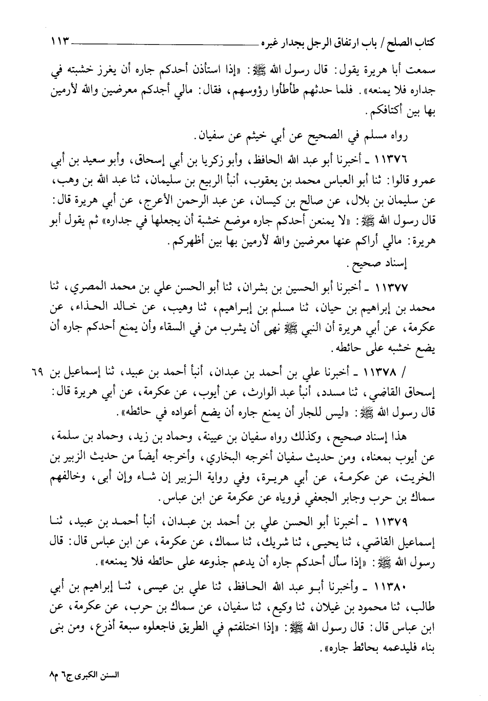 11376 - أَخْبَرَنَا أَبُو عَبْدِ اللهِ الْحَافِظُ، وَأَبُو زَكَرِيَّا بْنُ أَبِي إِسْحَاقَ، وَأَبُو سَعِيدِ بْنُ أَبِي عَمْرٍو، قَالُوا: ثنا أَبُو الْعَبَّاسِ مُحَمَّدُ بْنُ يَعْقُوبَ، أنبأ الرَّبِيعُ بْنُ سُلَيْمَانَ، ثنا عَبْدُ اللهِ بْنُ وَهْبٍ، عَنْ سُلَيْمَانَ بْنِ بِلَالٍ، عَنْ صَالِحِ بْنِ كَيْسَانَ، عَنْ عَبْدِ الرَّحْمَنِ الْأَعْرَجِ، عَنْ أَبِي هُرَيْرَةَ قَالَ: قَالَ رَسُولُ اللهِ صَلَّى اللهُ عَلَيْهِ وَسَلَّمَ: §" لَا يَمْنَعَنَّ أَحَدُكُمْ جَارَهُ مَوْضِعَ خَشَبَةٍ أَنْ يَجْعَلَهَا فِي جِدَارِهِ " ثُمَّ يَقُولُ أَبُو هُرَيْرَةَ: مَا لِي أَرَاكُمْ عَنْهَا مُعْرِضِينَ؟ وَاللهِ لَأَرْمِيَنَّ بِهَا بَيْنَ أَظْهُرِكُمْ. إِسْنَادٌ صَحِيحٌ