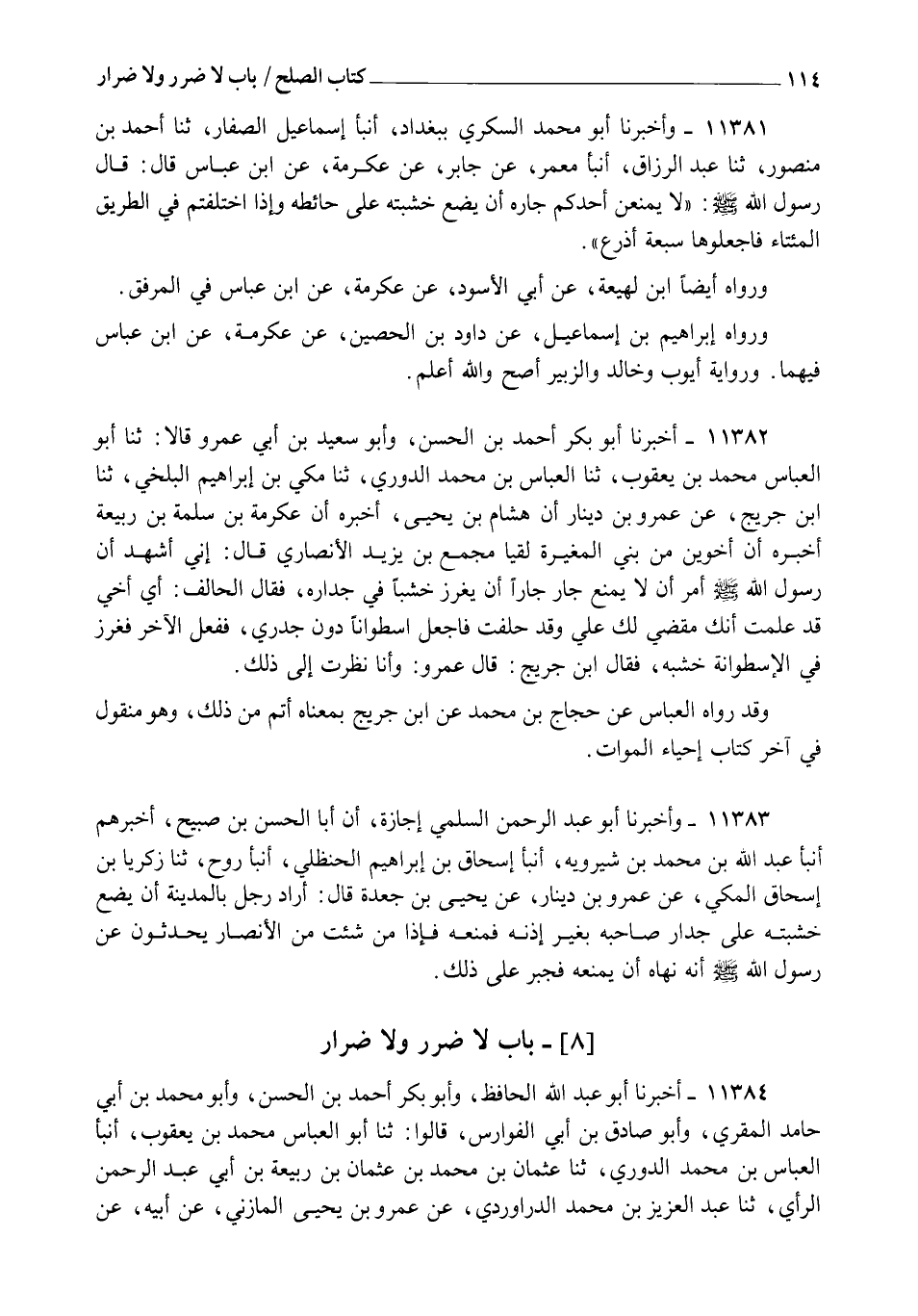 11383 - وَأَخْبَرَني أَبُو عَبْدِ الرَّحْمَنِ السُّلَمِيُّ إِجَازَةً، أَنَّ أَبَا الْحَسَنِ بْنَ صُبَيْحٍ أَخْبَرَهُمْ، أنبأ عَبْدُ اللهِ بْنُ مُحَمَّدِ بْنِ شِيرَوَيْهِ، أنبأ إِسْحَاقُ بْنُ إِبْرَاهِيمَ الْحَنْظَلِيُّ، أنبأ رَوْحٌ، ثنا زَكَرِيَّا بْنُ إِسْحَاقَ الْمَكِّيُّ، عَنْ عَمْرِو بْنِ دِينَارٍ، عَنْ يَحْيَى بْنِ جَعْدَةَ قَالَ: " أَرَادَ رَجُلٌ بِالْمَدِينَةِ أَنْ §يَضَعَ خَشَبَتَهُ عَلَى جِدَارِ صَاحِبِهِ بِغَيْرِ إِذْنِهِ، فَمَنَعَهُ، فَإِذَا مَنْ شِئْتَ مِنَ الْأَنْصَارِ يُحَدِّثُونَ عَنْ رَسُولِ اللهِ صَلَّى اللهُ عَلَيْهِ وَسَلَّمَ أَنَّهُ نَهَاهُ أَنْ يَمْنَعَهُ، فَجُبِرَ عَلَى ذَلِكَ "