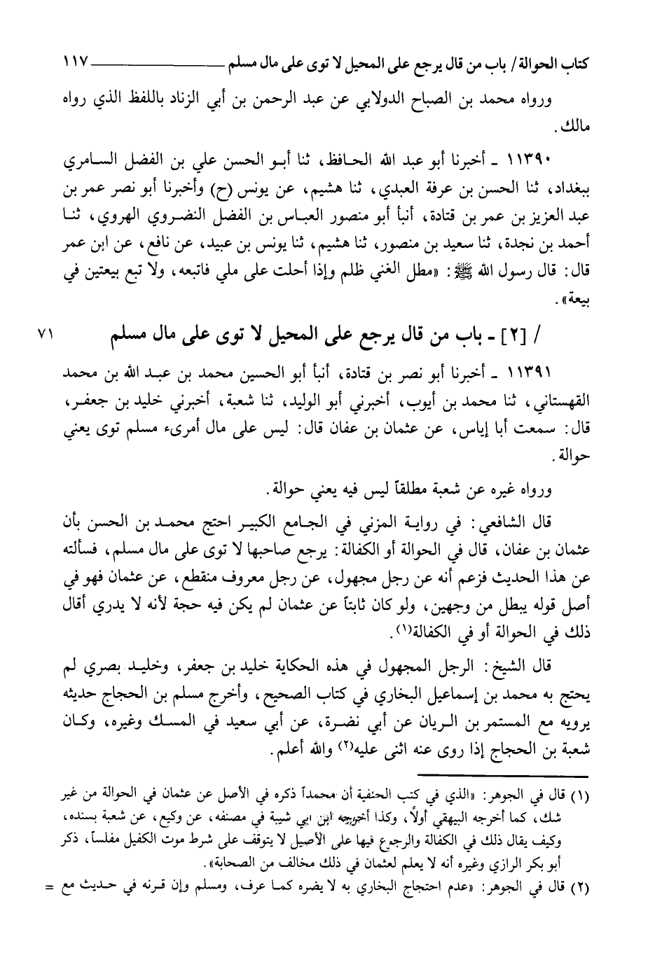 11391 - أَخْبَرَنَا أَبُو نَصْرِ بْنُ قَتَادَةَ، أنبأ أَبُو الْحُسَيْنِ مُحَمَّدُ بْنُ عَبْدِ اللهِ بْنِ مُحَمَّدٍ الْقُهُسْتَانِيُّ، ثنا مُحَمَّدُ بْنُ أَيُّوبَ، أَخْبَرَنِي أَبُو الْوَلِيدِ، ثنا شُعْبَةُ، أَخْبَرَنِي خُلَيْدُ بْنُ جَعْفَرٍ قَالَ: سَمِعْتُ أَبَا إِيَاسٍ، عَنْ عُثْمَانَ بْنِ عَفَّانَ قَالَ: §" لَيْسَ عَلَى مَالِ امْرِئٍ مُسْلِمٍ تَوًى " يَعْنِي حَوَالَةً وَرَوَاهُ غَيْرُهُ عَنْ شُعْبَةَ مُطْلَقًا، لَيْسَ فِيهِ يَعْنِي حَوَالَةً. قَالَ الشَّافِعِيُّ: فِي رِوَايَةِ الْمُزَنِيِّ فِي الْجَامِعِ الْكَبِيرِ، احْتَجَّ مُحَمَّدُ بْنُ الْحَسَنِ بِأَنَّ عُثْمَانَ بْنَ عَفَّانَ قَالَ، فِي الْحَوَالَةِ أَوِ الْكَفَالَةِ: يَرْجِعُ صَاحِبُهَا، لَا تَوَى عَلَى مَالِ مُسْلِمٍ، فَسَأَلْتُهُ عَنْ هَذَا الْحَدِيثِ، فَزَعَمَ أَنَّهُ عَنْ رَجُلٍ مَجْهُولٍ، عَنْ رَجُلٍ مَعْرُوفٍ مُنْقَطِعٌ، عَنْ عُثْمَانَ، فَهُوَ فِي أَصْلِ قَوْلِهِ يَبْطُلُ مِنْ وَجْهَيْنِ، وَلَوْ كَانَ ثَابِتًا عَنْ عُثْمَانَ لَمْ يَكُنْ فِيهِ حُجَّةٌ؛ لِأَنَّهُ لَا يَدْرِي أَقَالَ ذَلِكَ فِي الْحَوَالَةِ أَوْ فِي الْكَفَالَةِ قَالَ الشَّيْخُ: الرَّجُلُ الْمَجْهُولُ فِي هَذِهِ الْحِكَايَةِ خُلَيْدُ بْنُ جَعْفَرٍ، وَخُلَيْدٌ بَصْرِيٌّ لَمْ يَحْتَجَّ بِهِ مُحَمَّدُ بْنُ إِسْمَاعِيلَ الْبُخَارِيُّ فِي كِتَابِ الصَّحِيحِ وَأَخْرَجَ مُسْلِمُ بْنُ الْحَجَّاجِ حَدِيثَهُ الَّذِي، يَرْوِيهِ مَعَ الْمُسْتَمِرِّ بْنِ الرَّيَّانِ، عَنْ أَبِي نَضْرَةَ، عَنْ أَبِي سَعِيدٍ فِي الْمِسْكِ وَغَيْرِهِ، وَكَانَ شُعْبَةُ بْنُ الْحَجَّاجِ إِذَا رَوَى عَنْهُ أَثْنَى عَلَيْهِ، وَاللهُ أَعْلَمُ. -[118]- وَالْمُرَادُ بِالرَّجُلِ الْمَعْرُوفِ أَبُو إِيَاسٍ مُعَاوِيَةُ بْنُ قُرَّةَ الْمُزَنِيُّ، وَهُوَ مُنْقَطِعٌ كَمَا قَالَ، فَأَبُو إِيَاسٍ مِنَ الطَّبَقَةِ الثَّالِثَةِ مِنْ تَابِعِي أَهْلِ الْبَصْرَةِ، فَهُوَ لَمْ يُدْرِكْ عُثْمَانَ بْنَ عَفَّانَ، وَلَا كَانَ فِي زَمَانِهِ