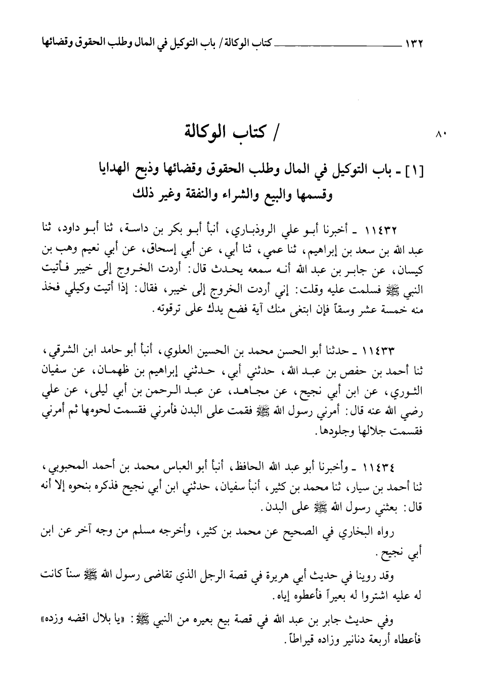 11434 - وَأَخْبَرَنَا أَبُو عَبْدِ اللهِ الْحَافِظُ، أنبأ أَبُو الْعَبَّاسِ مُحَمَّدُ بْنُ أَحْمَدَ الْمَحْبُوبِيُّ، ثنا أَحْمَدُ بْنُ سَيَّارٍ، ثنا مُحَمَّدُ بْنُ كَثِيرٍ، أنبأ سُفْيَانُ، حَدَّثَنِي ابْنُ أَبِي نَجِيحٍ، فَذَكَرَهُ بِنَحْوِهِ، إِلَّا أَنَّهُ قَالَ: بَعَثَنِي رَسُولُ اللهِ صَلَّى اللهُ عَلَيْهِ وَسَلَّمَ عَلَى الْبُدْنِ. رَوَاهُ الْبُخَارِيُّ فِي الصَّحِيحِ عَنْ مُحَمَّدِ بْنِ كَثِيرٍ , وَأَخْرَجَهُ مُسْلِمٌ مِنْ وَجْهٍ آخَرَ عَنِ ابْنِ أَبِي نَجِيحٍ وَقَدْ رُوِّينَا فِي حَدِيثِ أَبِي هُرَيْرَةَ فِي قِصَّةِ الرَّجُلِ الَّذِي تَقَاضَى رَسُولَ اللهِ صَلَّى اللهُ عَلَيْهِ وَسَلَّمَ سِنًّا كَانَتْ لَهُ عَلَيْهِ: " اشْتَرُوا لَهُ بَعِيرًا فَأَعْطُوهُ إِيَّاهُ "، وَفِي حَدِيثِ جَابِرِ بْنِ عَبْدِ اللهِ فِي قِصَّةِ بَيْعِ بَعِيرِهِ مِنَ النَّبِيِّ صَلَّى اللهُ عَلَيْهِ وَسَلَّمَ: " يَا بِلَالُ، اقْضِهِ وَزِدْهُ " فَأَعْطَاهُ أَرْبَعَةَ دَنَانِيرَ، وَزَادَهُ قِيرَاطًا