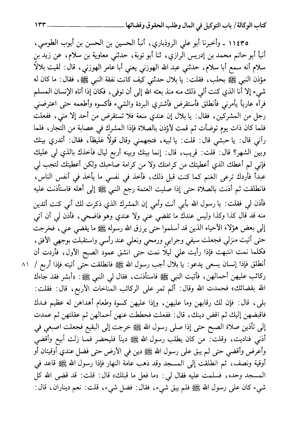 11435 - وَأَخْبَرَنَا أَبُو عَلِيٍّ الرُّوذْبَارِيُّ، أنبأ الْحُسَيْنُ بْنُ الْحَسَنِ بْنِ أَيُّوبَ الطُّوسِيُّ، أنبأ أَبُو حَاتِمٍ مُحَمَّدُ بْنُ إِدْرِيسَ الرَّازِيُّ، ثنا أَبُو تَوْبَةَ، حَدَّثَنِي مُعَاوِيَةُ بْنُ سَلَّامٍ، عَنْ زَيْدِ بْنِ سَلَّامٍ، أَنَّهُ سَمِعَ أَبَا سَلَّامٍ، حَدَّثَنِي عَبْدُ اللهِ الْهَوْزَنِيُّ يَعْنِي أَبَا عَامِرٍ الْهَوْزَنِيَّ قَالَ: لَقِيتُ بِلَالًا مُؤَذِّنَ النَّبِيِّ صَلَّى اللهُ عَلَيْهِ وَسَلَّمَ بِحَلَبَ، فَقُلْتُ: يَا بِلَالُ، حَدِّثْنِي كَيْفَ كَانَتْ نَفَقَةُ النَّبِيِّ صَلَّى اللهُ عَلَيْهِ وَسَلَّمَ؟ فَقَالَ: مَا كَانَ لَهُ شَيْءٌ إِلَّا أَنَا الَّذِي كُنْتُ أَلِي ذَلِكَ مِنْهُ مُنْذُ بَعَثَهُ اللهُ إِلَى أَنْ تُوُفِّيَ، فَكَانَ إِذَا أَتَاهُ الْإِنْسَانُ الْمُسْلِمُ فَرَآهُ عَارِيًا يَأْمُرُنِي فَأَنْطَلِقُ فَأَسْتَقْرِضُ فَأَشْتَرِيَ الْبُرْدَةَ وَالشَّيْءَ فَأَكْسُوَهُ وَأُطْعِمَهُ، حَتَّى اعْتَرَضَنِي رَجُلٌ مِنَ الْمُشْرِكِينَ فَقَالَ: يَا بِلَالُ، إِنَّ عِنْدِي سَعَةً، فَلَا تَسْتَقْرِضْ مِنْ أَحَدٍ إِلَّا مِنِّي، فَفَعَلْتُ، فَلَمَّا كَانَ ذَاتَ يَوْمٍ تَوَضَّأْتُ ثُمَّ قُمْتُ لِأُؤَذِّنَ بِالصَّلَاةِ، فَإِذَا الْمُشْرِكُ فِي عِصَابَةٍ مِنَ التُّجَّارِ، فَلَمَّا رَآنِي قَالَ: يَا حَبَشِيُّ، قَالَ: قُلْتُ: يَا لَبَيَّهِ، فَتَجَهَّمَنِي وَقَالَ قَوْلًا غَلِيظًا، فَقَالَ: أَتَدْرِي كَمْ بَيْنَكَ وَبَيْنَ الشَّهْرِ؟ قَالَ: قُلْتُ: قَرِيبٌ، قَالَ: إِنَّمَا بَيْنَكَ وَبَيْنَهُ أَرْبَعُ لَيَالٍ، فَآخُذُكَ بِالَّذِي لِي عَلَيْكَ، فَإِنِّي لَمْ أُعْطِكَ الَّذِي أَعْطَيْتُكَ مِنْ كَرَامَتِكَ، وَلَا مِنْ كَرَامَةِ صَاحِبِكَ، وَلَكِنْ أَعْطَيْتُكَ لِتَجِبَ لِي عَبْدًا؛ فَأَرُدُّكَ تَرْعَى الْغَنَمَ كَمَا كُنْتَ قَبْلَ ذَلِكَ، فَأَخَذَ فِي نَفْسِي مَا يَأْخُذُ فِي أَنْفُسِ النَّاسِ، فَانْطَلَقْتُ ثُمَّ أَذَّنْتُ بِالصَّلَاةِ، حَتَّى إِذَا صَلَّيْتُ الْعَتَمَةَ رَجَعَ النَّبِيُّ صَلَّى اللهُ عَلَيْهِ وَسَلَّمَ إِلَى أَهْلِهِ، فَاسْتَأْذَنْتُ عَلَيْهِ، فَأَذِنَ لِي، فَقُلْتُ: يَا رَسُولَ اللهِ، بِأَبِي أَنْتَ وَأُمِّي، إِنَّ الْمُشْرِكَ الَّذِي ذَكَرْتُ لَكَ أَنِّي كُنْتُ أَتَدَيَّنُ مِنْهُ قَدْ قَالَ كَذَا وَكَذَا، وَلَيْسَ عِنْدَكَ مَا تَقْضِي عَنِّي، وَلَا عِنْدِي، وَهُوَ فَاضِحِي، فَأَذِنَ لِي أَنْ آتِيَ إِلَى بَعْضِ هَؤُلَاءِ الْأَحْيَاءِ الَّذِينَ قَدْ أَسْلَمُوا حَتَّى يَرْزُقَ اللهُ رَسُولَهُ صَلَّى اللهُ عَلَيْهِ وَسَلَّمَ مَا يَقْضِي عَنِّي، فَخَرَجْتُ حَتَّى أَتَيْتُ مَنْزِلِي، فَجَعَلْتُ سَيْفِي وَجِرَابِي وَرُمْحِي وَنَعْلِي عِنْدَ رَأْسِي وَاسْتَقْبَلْتُ بِوَجْهِيَ الْأُفُقَ، فَكُلَّمَا نِمْتُ انْتَبَهْتُ فَإِذَا رَأَيْتُ عَلَيَّ لَيْلًا نِمْتُ، حَتَّى انْشَقَّ عَمُودُ الصُّبْحِ الْأَوَّلِ، فَأَرَدْتُ أَنْ أَنْطَلِقَ، فَإِذَا إِنْسَانٌ يَسْعَى يَدْعُو: يَا بِلَالُ، أَجِبْ رَسُولَ اللهِ صَلَّى اللهُ عَلَيْهِ وَسَلَّمَ، فَانْطَلَقْتُ حَتَّى أَتَيْتُهُ، فَإِذَا أَرْبَعُ رَكَائِبَ عَلَيْهِنَّ أَحْمَالُهُنَّ، فَأَتَيْتُ النَّبِيَّ صَلَّى اللهُ عَلَيْهِ وَسَلَّمَ فَاسْتَأْذَنْتُ، فَقَالَ لِيَ النَّبِيُّ صَلَّى اللهُ عَلَيْهِ وَسَلَّمَ: " §أَبْشِرْ؛ فَقَدْ جَاءَكَ اللهُ بِقَضَائِكَ "، فَحَمِدْتُ اللهَ، وَقَالَ: " أَلَمْ تَمُرَّ عَلَى الرَّكَائِبِ الْمُنَاخَاتِ الْأَرْبَعِ؟ " قَالَ: فَقُلْتُ: بَلَى، قَالَ: " فَإِنَّ لَكَ رِقَابَهُنَّ وَمَا عَلَيْهِنَّ "، وَإِذَا عَلَيْهِنَّ كِسْوَةٌ وَطَعَامٌ أَهْدَاهُنَّ لَهُ عَظِيمُ فَدَكٍ، " فَاقْبِضْهُنَّ إِلَيْكَ ثُمَّ اقْضِ دَيْنَكَ "، قَالَ: فَفَعَلْتُ فَحَطَطْتُ ع
