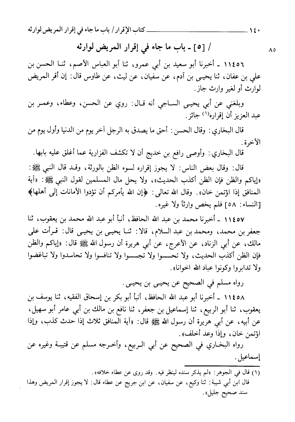 11456 - أَخْبَرَنَا أَبُو سَعِيدِ بْنُ أَبِي عَمْرٍو، ثنا أَبُو الْعَبَّاسِ الْأَصَمُّ، ثنا الْحَسَنُ بْنُ عَلِيِّ بْنِ عَفَّانَ، ثنا يَحْيَى بْنُ آدَمَ، عَنْ سُفْيَانَ، عَنْ لَيْثٍ، عَنْ طَاوُسٍ قَالَ: §" إِنْ أَقَرَّ الْمَرِيضُ لِوَارِثٍ أَوْ لِغَيْرِ وَارِثٍ جَازَ " وَبَلَغَنِي عَنْ أَبِي يَحْيَى السَّاجِيِّ أَنَّهُ قَالَ: رُوِيَ عَنِ الْحَسَنِ وَعَطَاءٍ وَعُمَرَ بْنِ عَبْدِ الْعَزِيزِ أَنَّ إِقْرَارَهُ جَائِزٌ. قَالَ الْبُخَارِيُّ وَقَالَ الْحَسَنُ: أَحَقُّ مَا يَصْدُقُ بِهِ الرَّجُلُ آخِرُ يَوْمٍ مِنَ الدُّنْيَا وَأَوَّلُ يَوْمٍ مِنَ الْآخِرَةِ قَالَ الْبُخَارِيُّ: وَأَوْصَى رَافِعُ بْنُ خَدِيجٍ أَنْ لَا تَكْشِفَ الْفَزَارِيَّةُ عَمَّا أُغْلِقَ عَلَيْهِ بَابُهَا قَالَ: وَقَالَ بَعْضُ النَّاسِ: لَا يَجُوزُ إِقْرَارُهُ لِسُوءِ الظَّنِّ بِالْوَرَثَةِ، وَقَدْ قَالَ النَّبِيُّ صَلَّى اللهُ عَلَيْهِ وَسَلَّمَ: " إِيَّاكُمْ وَالظَّنَّ؛ فَإِنَّ الظَّنَّ أَكْذَبُ الْحَدِيثِ " , وَلَا يَحِلُّ مَالُ الْمُسْلِمِينَ لِقَوْلِ النَّبِيِّ صَلَّى اللهُ عَلَيْهِ وَسَلَّمَ: " آيَةُ الْمُنَافِقِ إِذَا اؤْتُمِنَ خَانَ "، وَقَالَ اللهُ تَعَالَى {إِنَّ اللهَ يَأْمُرُكُمْ أَنْ تُؤَدُّوا الْأَمَانَاتِ إِلَى أَهْلِهَا} [النساء: 58]، فَلَمْ يَخُصَّ وَارِثًا وَلَا غَيْرَهُ