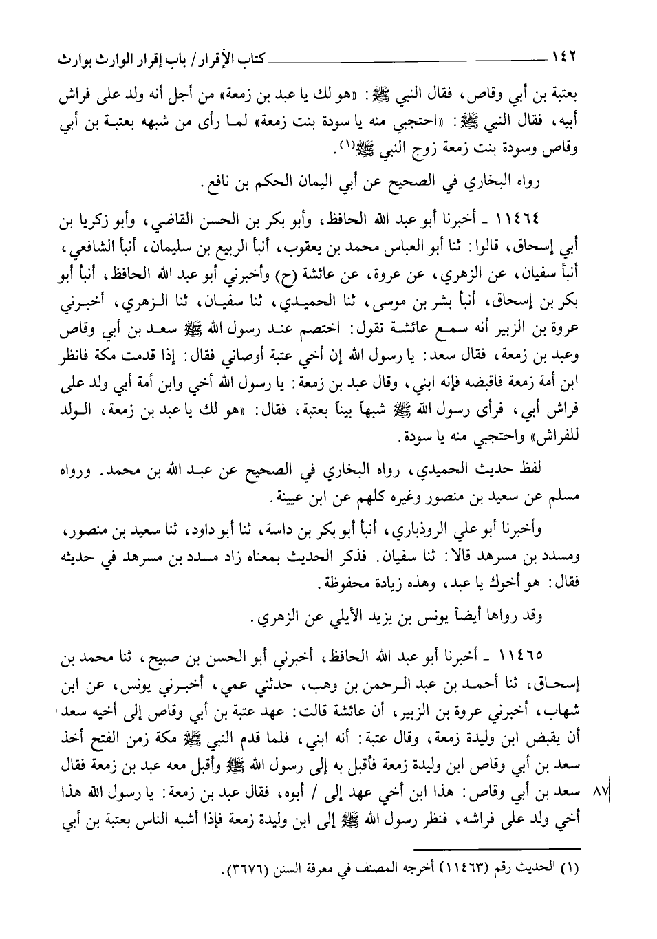 11464 - أَخْبَرَنَا أَبُو عَبْدِ اللهِ الْحَافِظُ، وَأَبُو بَكْرِ بْنُ الْحَسَنِ الْقَاضِي، وَأَبُو زَكَرِيَّا بْنُ أَبِي إِسْحَاقَ، قَالُوا: ثنا أَبُو الْعَبَّاسِ مُحَمَّدُ بْنُ يَعْقُوبَ، أنبأ الرَّبِيعُ بْنُ سُلَيْمَانَ، أنبأ الشَّافِعِيُّ، أنبأ سُفْيَانُ، عَنِ الزُّهْرِيِّ، عَنْ عُرْوَةَ، عَنْ عَائِشَةَ، ح وَأَخْبَرَنِي أَبُو عَبْدِ اللهِ الْحَافِظُ، أنبأ أَبُو بَكْرِ بْنُ إِسْحَاقَ، أنبأ بِشْرُ بْنُ مُوسَى، ثنا الْحُمَيْدِيُّ، ثنا سُفْيَانُ، ثنا الزُّهْرِيُّ، أَخْبَرَنِي عُرْوَةُ بْنُ الزُّبَيْرِ، أَنَّهُ سَمِعَ عَائِشَةَ تَقُولُ: اخْتَصَمَ عِنْدَ رَسُولِ اللهِ صَلَّى اللهُ عَلَيْهِ وَسَلَّمَ سَعْدُ بْنُ أَبِي وَقَّاصٍ وَعَبْدُ بْنُ زَمْعَةَ، فَقَالَ سَعْدٌ: يَا رَسُولَ اللهِ، إِنَّ أَخِي عُتْبَةَ أَوْصَانِي فَقَالَ: إِذَا قَدِمْتَ مَكَّةَ فَانْظُرِ ابْنَ أَمَةِ زَمْعَةَ فَاقْبِضْهُ؛ فَإِنَّهُ ابْنِي، وَقَالَ عَبْدُ بْنُ زَمْعَةَ: يَا رَسُولَ اللهِ، أَخِي وَابْنُ أَمَةِ أَبِي، وُلِدَ عَلَى فِرَاشِ أَبِي، فَرَأَى رَسُولُ اللهِ صَلَّى اللهُ عَلَيْهِ وَسَلَّمَ شَبَهًا بَيِّنًا بِعُتْبَةَ فَقَالَ: " هُوَ لَكَ يَا عَبْدُ بْنَ زَمْعَةَ، §الْوَلَدُ لِلْفِرَاشِ، وَاحْتَجِبِي مِنْهُ يَا سَوْدَةُ " لَفْظُ حَدِيثِ الْحُمَيْدِيِّ رَوَاهُ الْبُخَارِيُّ فِي الصَّحِيحِ عَنْ عَبْدِ اللهِ بْنِ مُحَمَّدٍ، وَرَوَاهُ مُسْلِمٌ عَنْ سَعِيدِ بْنِ مَنْصُورٍ وَغَيْرِهِ، كُلُّهُمْ عَنِ ابْنِ عُيَيْنَةَ. وَأَخْبَرَنَا أَبُو عَلِيٍّ الرُّوذْبَارِيُّ، أنبأ أَبُو بَكْرِ بْنُ دَاسَةَ، ثنا أَبُو دَاوُدَ، ثنا سَعِيدُ بْنُ مَنْصُورٍ وَمُسَدَّدُ بْنُ مُسَرْهَدٍ، قَالَا: ثنا سُفْيَانُ، فَذَكَرَ الْحَدِيثَ بِمَعْنَاهُ، زَادَ مُسَدَّدُ بْنُ مُسَرْهَدٍ فِي حَدِيثِهِ فَقَالَ: " هُوَ أَخُوكَ يَا عَبْدُ ". وَهَذِهِ زِيَادَةٌ مَحْفُوظَةٌ، وَقَدْ رَوَاهَا أَيْضًا يُونُسُ بْنُ يَزِيدَ الْأَيْلِيُّ عَنِ الزُّهْرِيِّ
