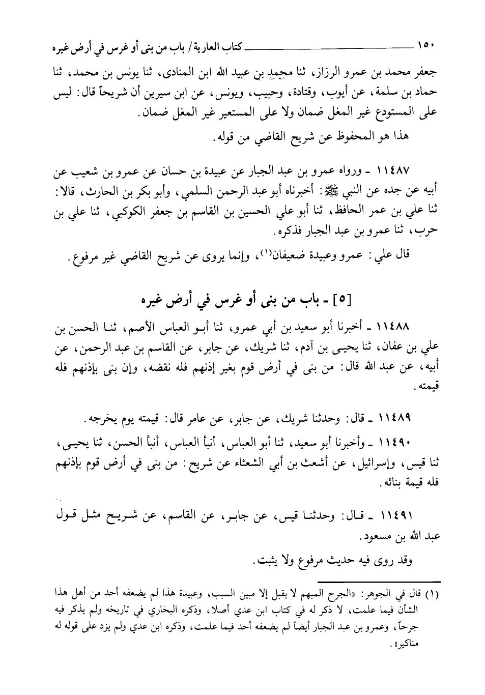 11488 - أَخْبَرَنَا أَبُو سَعِيدِ بْنُ أَبِي عَمْرٍو، ثنا أَبُو الْعَبَّاسِ الْأَصَمُّ، ثنا الْحَسَنُ بْنُ عَلِيِّ بْنِ عَفَّانَ، ثنا يَحْيَى بْنُ آدَمَ، ثنا شَرِيكٌ، عَنْ جَابِرٍ، عَنِ الْقَاسِمِ بْنِ عَبْدِ الرَّحْمَنِ، عَنْ أَبِيهِ، عَنْ عَبْدِ اللهِ قَالَ: " §مَنْ بَنَى فِي أَرْضِ قَوْمٍ بِغَيْرِ إِذْنِهِمْ فَلَهُ نَقْضُهُ، وَإِنْ بَنَى بِإِذْنِهِمْ فَلَهُ قِيمَتُهُ