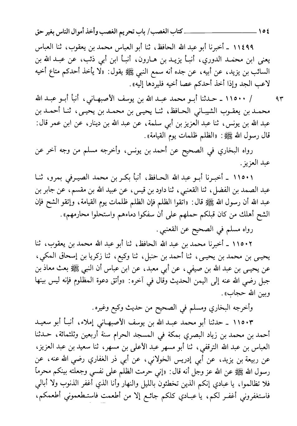 11500 - حَدَّثَنَا أَبُو مُحَمَّدٍ عَبْدُ اللهِ بْنُ يُوسُفَ الْأَصْبَهَانِيُّ، أنبأ أَبُو عَبْدِ اللهِ مُحَمَّدُ بْنُ يَعْقُوبَ الشَّيْبَانِيُّ الْحَافِظُ، ثنا يَحْيَى بْنُ مُحَمَّدِ بْنِ يَحْيَى، ثنا أَحْمَدُ بْنُ عَبْدِ اللهِ بْنِ يُونُسَ، ثنا عَبْدُ الْعَزِيزِ بْنُ أَبِي سَلَمَةَ، عَنْ عَبْدِ اللهِ بْنِ دِينَارٍ، عَنِ ابْنِ عُمَرَ قَالَ: قَالَ رَسُولُ اللهِ صَلَّى اللهُ عَلَيْهِ وَسَلَّمَ: §" الظُّلْمُ ظُلُمَاتٌ يَوْمَ الْقِيَامَةِ " رَوَاهُ الْبُخَارِيُّ فِي الصَّحِيحِ عَنْ أَحْمَدَ بْنِ يُونُسَ، وَأَخْرَجَهُ مُسْلِمٌ مِنْ وَجْهٍ آخَرَ عَنْ عَبْدِ الْعَزِيزِ
