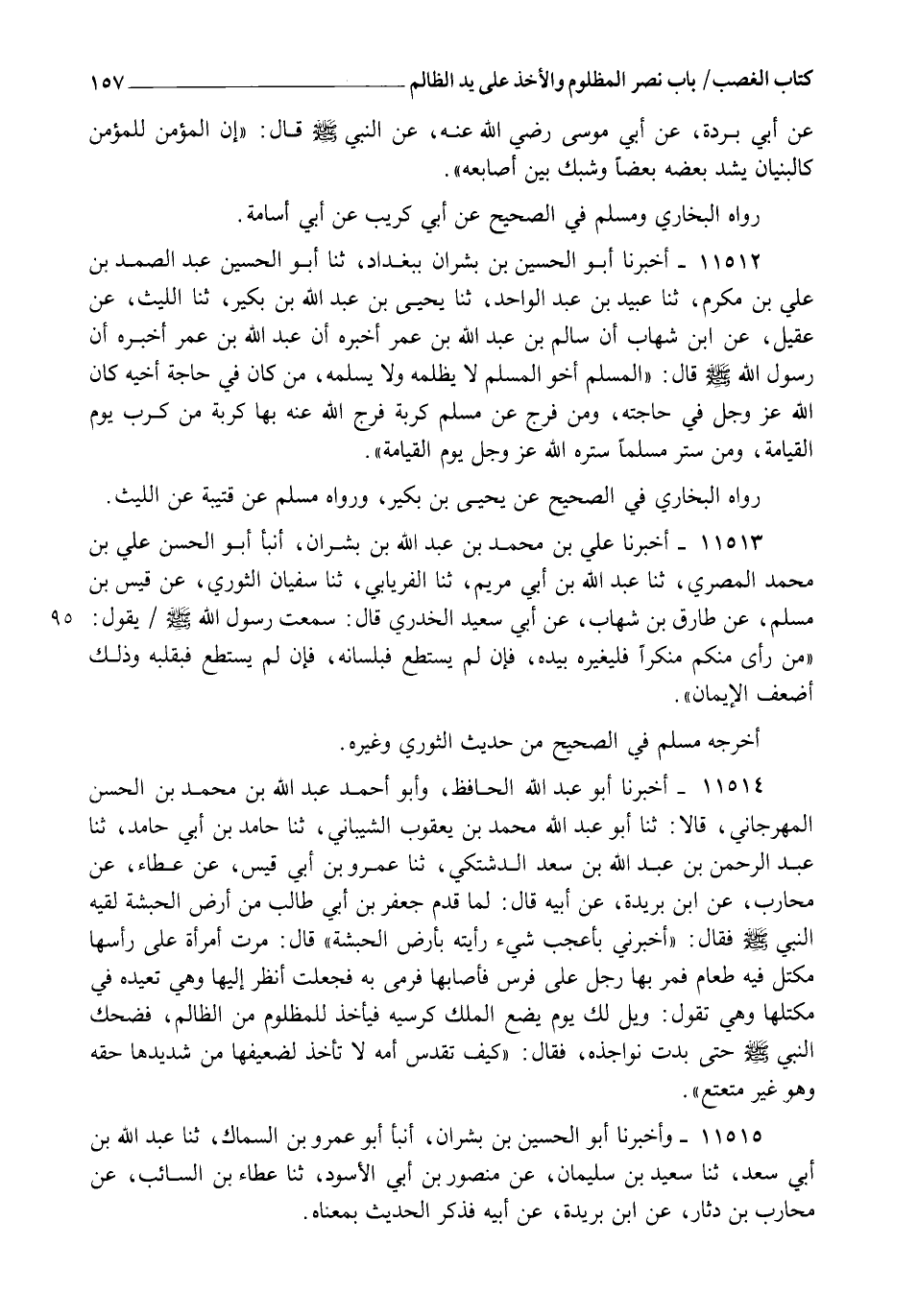11512 - أَخْبَرَنَا أَبُو الْحُسَيْنِ بْنُ بِشْرَانَ بِبَغْدَادَ، ثنا أَبُو الْحُسَيْنِ عَبْدُ الصَّمَدِ بْنُ عَلِيِّ بْنِ مُكْرَمٍ، ثنا عُبَيْدُ بْنُ عَبْدِ الْوَاحِدِ، ثنا يَحْيَى بْنُ عَبْدِ اللهِ بْنِ بُكَيْرٍ، ثنا اللَّيْثُ، عَنْ عُقَيْلٍ، عَنِ ابْنِ شِهَابٍ، أَنَّ سَالِمَ بْنَ عَبْدِ اللهِ بْنِ عُمَرَ أَخْبَرَهُ أَنَّ عَبْدَ اللهِ بْنَ عُمَرَ أَخْبَرَهُ، أَنَّ رَسُولَ اللهِ صَلَّى اللهُ عَلَيْهِ وَسَلَّمَ قَالَ: " §الْمُسْلِمُ أَخُو الْمُسْلِمِ، لَا يَظْلِمُهُ، وَلَا يُسْلِمُهُ، مَنْ كَانَ فِي حَاجَةِ أَخِيهِ كَانَ اللهُ عَزَّ وَجَلَّ فِي حَاجَتِهِ، وَمَنْ فَرَّجَ عَنْ مُسْلِمٍ كُرْبَةً فَرَّجَ اللهُ عَنْهُ بِهَا كُرْبَةً مِنْ كُرَبِ يَوْمِ الْقِيَامَةِ، وَمَنْ سَتَرَ مُسْلِمًا سَتَرَهُ اللهُ عَزَّ وَجَلَّ يَوْمَ الْقِيَامَةَ " رَوَاهُ الْبُخَارِيُّ فِي الصَّحِيحِ عَنْ يَحْيَى بْنِ بُكَيْرٍ وَرَوَاهُ مُسْلِمٌ عَنْ قُتَيْبَةَ عَنِ اللَّيْثِ