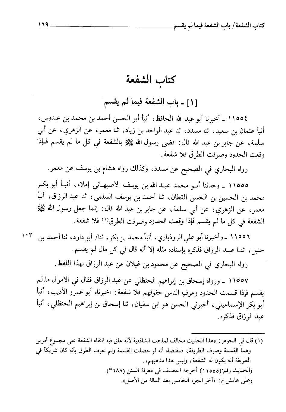 11554 - أَخْبَرَنَا أَبُو عَبْدِ اللهِ الْحَافِظُ، أنبأ أَبُو الْحَسَنِ أَحْمَدُ بْنُ مُحَمَّدِ بْنِ عُبْدُوسٍ، أنبأ عُثْمَانُ بْنُ سَعِيدٍ، ثنا مُسَدَّدٌ، ثنا عَبْدُ الْوَاحِدِ بْنُ زِيَادٍ، ثنا مَعْمَرٌ، عَنِ الزُّهْرِيِّ، عَنْ أَبِي سَلَمَةَ، عَنْ جَابِرِ بْنِ عَبْدِ اللهِ قَالَ: §" قَضَى رَسُولُ اللهِ صَلَّى اللهُ عَلَيْهِ وَسَلَّمَ بِالشُّفْعَةِ فِي كُلِّ مَا لَمْ يُقْسَمْ، فَإِذَا وَقَعَتِ الْحُدُودُ، وَصُرِّفَتِ الطُّرُقُ، فَلَا شُفْعَةَ " رَوَاهُ الْبُخَارِيُّ فِي الصَّحِيحِ عَنْ مُسَدَّدٍ , وَكَذَلِكَ رَوَاهُ هِشَامُ بْنُ يُوسُفَ، عَنْ مَعْمَرٍ