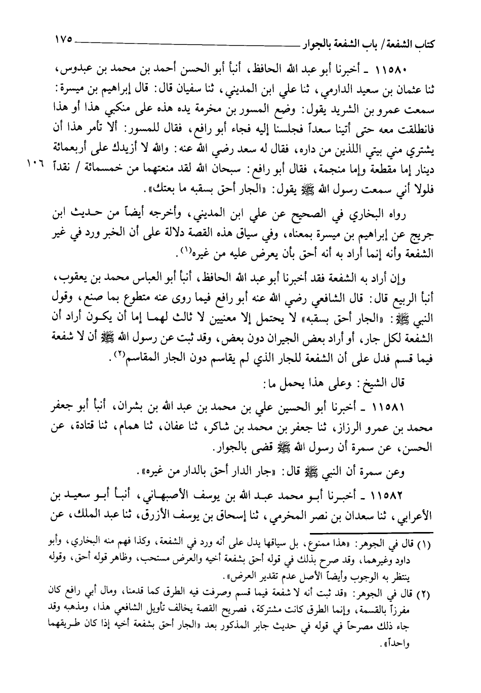 11580 - أَخْبَرَنَا أَبُو عَبْدِ اللهِ الْحَافِظُ، أنبأ أَبُو الْحَسَنِ أَحْمَدُ بْنُ مُحَمَّدِ بْنِ عُبْدُوسٍ، ثنا عُثْمَانُ بْنُ سَعِيدٍ الدَّارِمِيِّ، ثنا عَلِيُّ بْنُ الْمَدِينِيِّ، ثنا سُفْيَانُ قَالَ: قَالَ إِبْرَاهِيمُ بْنُ مَيْسَرَةَ: سَمِعْتُ عَمْرَو بْنَ الشَّرِيدِ يَقُولُ: وَضَعَ الْمِسْوَرُ بْنُ مَخْرَمَةَ يَدَهُ هَذِهِ عَلَى مَنْكِبِي هَذَا، أَوْ هَذَا، فَانْطَلَقْتُ مَعَهُ حَتَّى أَتَيْنَا سَعْدًا، فَجَلَسْنَا إِلَيْهِ، فَجَاءَ أَبُو رَافِعٍ فَقَالَ لِلْمِسْوَرِ: أَلَا تَأْمُرُ هَذَا أَنْ يَشْتَرِيَ مِنِّي بَيْتِيَّ اللَّذَيْنِ مِنْ دَارِهِ؟ فَقَالَ لَهُ سَعْدٌ رَضِيَ اللهُ عَنْهُ: وَاللهِ لَا أَزِيدُكَ عَلَى أَرْبَعِمِائَةِ دِينَارٍ إِمَّا مُقَطَّعَةً وَإِمَّا مُنَجَّمَةً، فَقَالَ أَبُو رَافِعٍ: سُبْحَانَ اللهِ لَقَدْ مَنَعْتُهُمَا مِنْ خَمْسِمِائَةٍ نَقْدًا، فَلَوْلَا أَنِّي سَمِعْتُ رَسُولَ اللهِ صَلَّى اللهُ عَلَيْهِ وَسَلَّمَ يَقُولُ: §" الْجَارُ أَحَقُّ بِسَقَبِهِ " مَا بِعْتُكَ رَوَاهُ الْبُخَارِيُّ فِي الصَّحِيحِ عَنْ عَلِيِّ بْنِ الْمَدِينِيِّ، وَأَخْرَجَهُ أَيْضًا مِنْ حَدِيثِ ابْنِ جُرَيْجٍ عَنْ إِبْرَاهِيمَ بْنِ مَيْسَرَةَ بِمَعْنَاهُ. وَفِي سِيَاقِ هَذِهِ الْقِصَّةِ دَلَالَةٌ عَلَى أَنَّ الْخَبَرَ وَرَدَ فِي غَيْرِ الشُّفْعَةِ، وَأَنَّهُ إِنَّمَا أَرَادَ بِهِ أَنَّهُ أَحَقُّ بِأَنْ يَعْرِضَ عَلَيْهِ مِنْ غَيْرِهِ، وَإِنْ أَرَادَ بِهِ الشُّفْعَةَ فَقَدْ أَخْبَرَنَا أَبُو عَبْدِ اللهِ الْحَافِظُ، أَنْبَأَ أَبُو الْعَبَّاسِ مُحَمَّدُ بْنُ يَعْقُوبَ، أَنْبَأَ الرَّبِيعُ قَالَ: قَالَ الشَّافِعِيُّ رَضِيَ اللهُ عَنْهُ: أَبُو رَافِعٍ فِيمَا رُوِيَ عَنْهُ مُتَطَوِّعٌ بِمَا صَنَعَ، وَقَوْلُ النَّبِيِّ صَلَّى اللهُ عَلَيْهِ وَسَلَّمَ: " الْجَارُ أَحَقُّ بِسَقَبِهِ "، لَا يَحْتَمِلُ إِلَّا مَعْنَيَيْنِ لَا ثَالِثَ لَهُمَا، إِمَّا أَنْ يَكُونَ أَرَادَ أَنَّ الشُّفْعَةَ لِكُلِّ جَارٍ، أَوْ أَرَادَ بَعْضَ الْجِيرَانِ دُونَ بَعْضٍ، وَقَدْ ثَبَتَ عَنْ رَسُولِ اللهِ صَلَّى اللهُ عَلَيْهِ وَسَلَّمَ أَنْ لَا شُفْعَةَ فِيمَا قُسِمَ، فَدَلَّ عَلَى أَنَّ الشُّفْعَةَ لِلْجَارِ الَّذِي لَمْ يُقَاسِمْ دُونَ الْجَارِ الْمُقَاسِمِ. قَالَ الشَّيْخُ: وَعَلَى هَذَا يُحْمَلُ مَا: