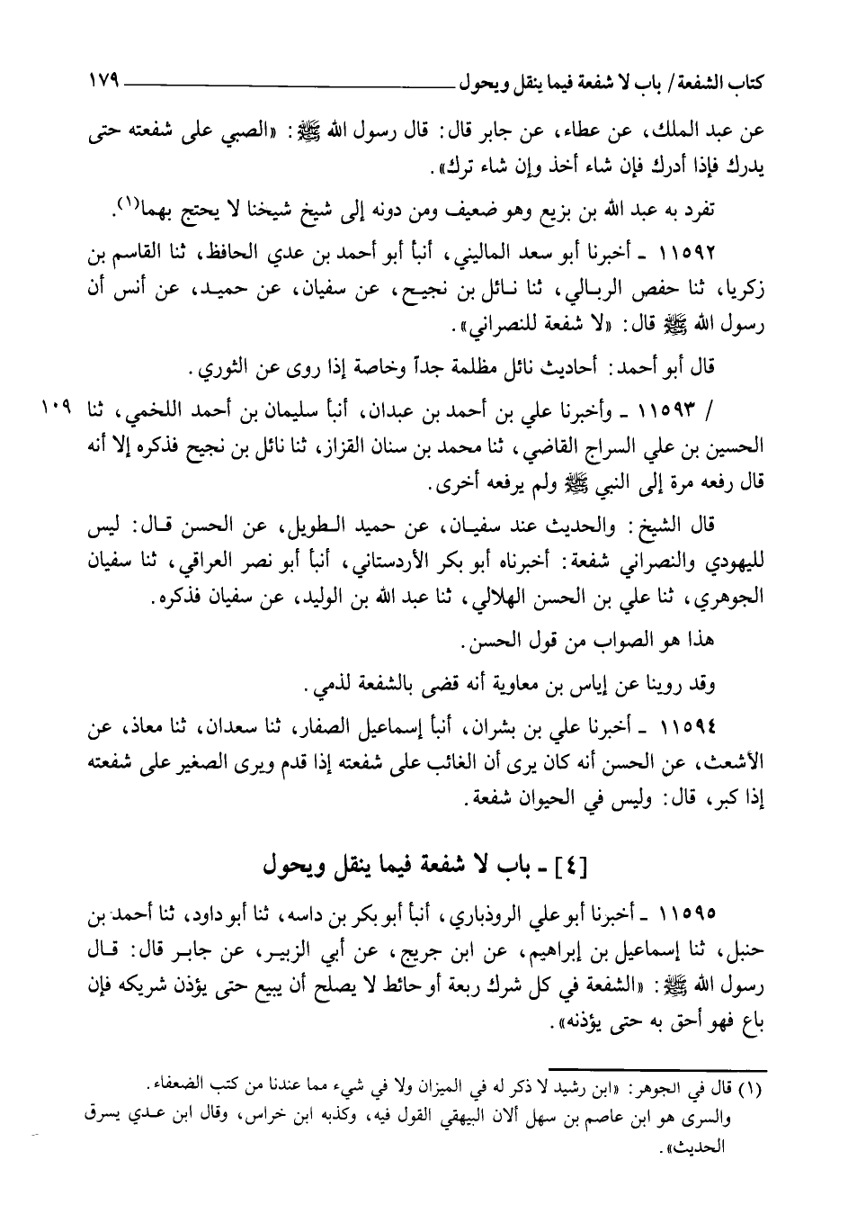 11593 - وَأَخْبَرَنَا عَلِيُّ بْنُ أَحْمَدَ بْنِ عَبْدَانَ، أنبأ سُلَيْمَانُ بْنُ أَحْمَدَ اللَّخْمِيُّ، ثنا الْحُسَيْنُ بْنُ عَلِيٍّ السَّرَّاجُ الْقَاضِي، ثنا مُحَمَّدُ بْنُ سِنَانٍ الْقَزَّازُ، ثنا نَائِلُ بْنُ نَجِيحٍ فَذَكَرَهُ، إِلَّا أَنَّهُ قَالَ: رَفَعَهُ مَرَّةً إِلَى النَّبِيِّ صَلَّى اللهُ عَلَيْهِ وَسَلَّمَ، وَلَمْ يَرْفَعْهُ أُخْرَى. قَالَ الشَّيْخُ: وَالْحَدِيثُ عِنْدَ سُفْيَانَ عَنْ حُمَيْدٍ الطَّوِيلِ، عَنِ الْحَسَنِ قَالَ: " لَيْسَ لِلْيَهُودِيِّ وَالنَّصْرَانِيِّ شُفْعَةٌ " أَخْبَرَنَاهُ أَبُو بَكْرٍ الْأَرْدَسْتَانِيُّ، أَنْبَأَ أَبُو نَصْرٍ الْعِرَاقِيُّ، ثنا سُفْيَانُ الْجَوْهَرِيُّ، ثنا عَلِيُّ بْنُ الْحَسَنِ الْهِلَالِيُّ، ثنا عَبْدُ اللهِ بْنُ الْوَلِيدِ، عَنْ سُفْيَانَ فَذَكَرَهُ، هَذَا هُوَ الصَّوَابُ مِنْ قَوْلِ الْحَسَنِ، وَقَدْ رُوِّينَا عَنْ إِيَاسِ بْنِ مُعَاوِيَةَ أَنَّهُ قَضَى بِالشُّفْعَةِ لِذِمِّيٍّ