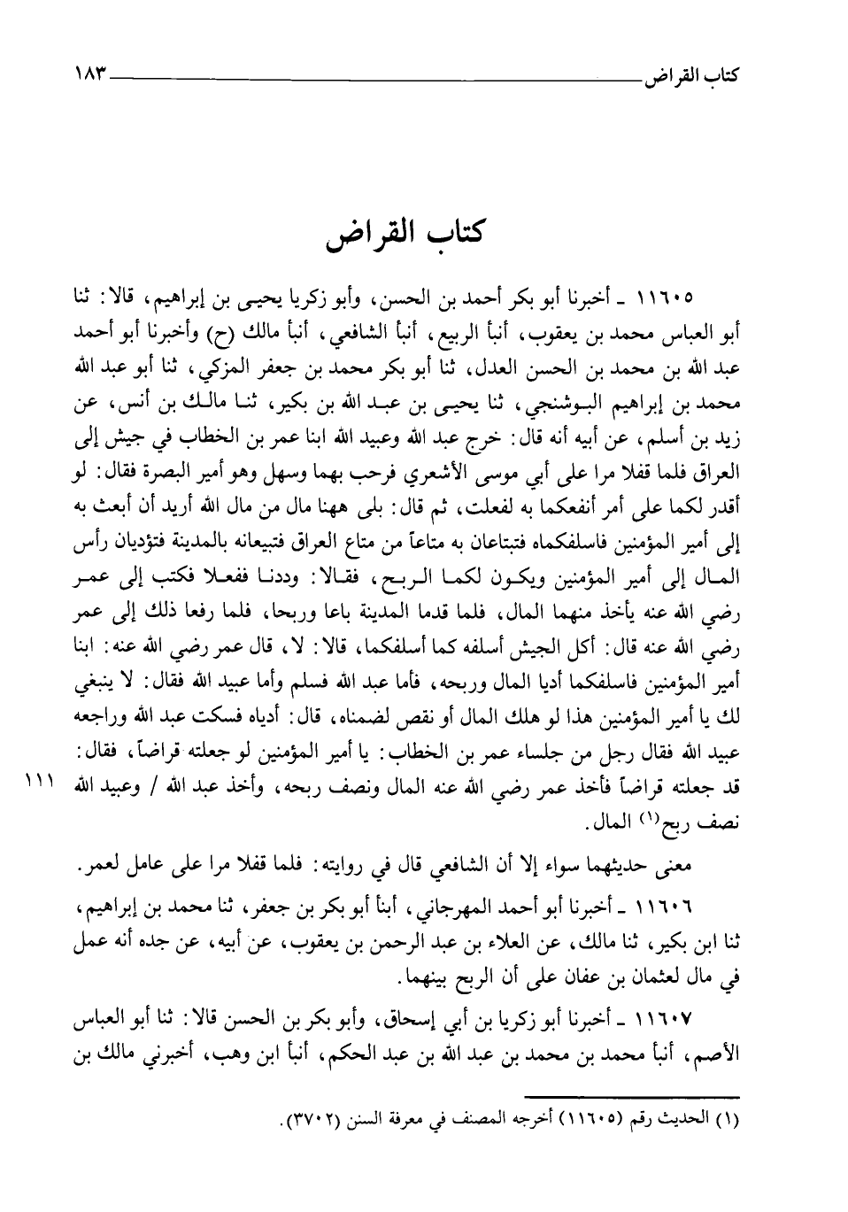 11605 - أَخْبَرَنَا أَبُو بَكْرٍ أَحْمَدُ بْنُ الْحَسَنِ، وَأَبُو زَكَرِيَّا يَحْيَى بْنُ إِبْرَاهِيمَ، قَالَا: ثنا أَبُو الْعَبَّاسِ مُحَمَّدُ بْنُ يَعْقُوبَ، أنبأ الرَّبِيعُ، أنبأ الشَّافِعِيُّ، أنبأ مَالِكٌ، ح وَأَخْبَرَنَا أَبُو أَحْمَدَ عَبْدُ اللهِ بْنُ مُحَمَّدِ بْنِ الْحَسَنِ الْعَدْلُ، ثنا أَبُو بَكْرٍ مُحَمَّدُ بْنُ جَعْفَرٍ الْمُزَكِّي، ثنا أَبُو عَبْدِ اللهِ مُحَمَّدُ بْنُ إِبْرَاهِيمَ الْبُوشَنْجِيُّ، ثنا يَحْيَى بْنُ عَبْدِ اللهِ بْنِ بُكَيْرٍ، ثنا مَالِكُ بْنُ أَنَسٍ، عَنْ زَيْدِ بْنِ أَسْلَمَ، عَنْ أَبِيهِ أَنَّهُ قَالَ: خَرَجَ عَبْدُ اللهِ وَعُبَيْدُ اللهِ ابْنَا عُمَرَ بْنِ الْخَطَّابِ فِي جَيْشٍ إِلَى الْعِرَاقِ، فَلَمَّا قَفَلَا مَرَّا عَلَى أَبِي مُوسَى الْأَشْعَرِيِّ، فَرَحَّبَ بِهِمَا وَسَهَّلَ، وَهُوَ أَمِيرُ الْبَصْرَةِ، فَقَالَ: لَوْ أَقْدِرُ لَكُمَا عَلَى أَمْرٍ أَنْفَعُكُمَا بِهِ لَفَعَلْتُ، ثُمَّ قَالَ: بَلَى، هَاهُنَا مَالٌ مِنْ مَالِ اللهِ، أُرِيدُ أَنْ أَبْعَثَ بِهِ إِلَى أَمِيرِ الْمُؤْمِنِينَ، فأُسَلِّفُكُمَاهُ فَتَبْتَاعَانِ بِهِ مَتَاعًا مِنْ مَتَاعِ الْعِرَاقِ فَتَبِيعَانِهِ بِالْمَدِينَةِ، فَتُؤَدِّيَانِ رَأْسَ الْمَالِ إِلَى أَمِيرِ الْمُؤْمِنِينَ وَيَكُونُ لَكُمَا الرِّبْحُ، فَقَالَا: وَدِدْنَا، فَفَعَلَا، فَكَتَبَ إِلَى عُمَرَ رَضِيَ اللهُ عَنْهُ يَأْخُذُ مِنْهُمَا الْمَالَ، فَلَمَّا قَدِمَا الْمَدِينَةَ بَاعَا وَرَبِحَا، فَلَمَّا رَفَعَا ذَلِكَ إِلَى عُمَرَ رَضِيَ اللهُ عَنْهُ قَالَ: " أَكُلُّ الْجَيْشِ أَسْلَفَهُ كَمَا أَسْلَفَكُمَا؟ " قَالَا: لَا، قَالَ عُمَرُ رَضِيَ اللهُ عَنْهُ: " ابْنَا أَمِيرِ الْمُؤْمِنِينَ فَأَسْلَفَكُمَا، §أَدِّيَا الْمَالَ وَرِبْحَهُ " فَأَمَّا عَبْدُ اللهِ فَسَلَّمَ، وَأَمَّا عُبَيْدُ اللهِ فَقَالَ: لَا يَنْبَغِي لَكَ يَا أَمِيرَ الْمُؤْمِنِينَ، هَذَا لَوْ هَلَكَ الْمَالُ أَوْ نَقَصَ لَضَمِنَّاهُ، قَالَ: " أَدِّيَاهُ "، فَسَكَتَ عَبْدُ اللهِ، وَرَاجَعَهُ عُبَيْدُ اللهِ، فَقَالَ رَجُلٌ مِنْ جُلَسَاءِ عُمَرَ بْنِ الْخَطَّابِ: يَا أَمِيرَ الْمُؤْمِنِينَ، لَوْ جَعَلْتَهُ قِرَاضًا، فَقَالَ: " قَدْ جَعَلْتُهُ قِرَاضًا "، فَأَخَذَ عُمَرُ رَضِيَ اللهُ عَنْهُ الْمَالَ وَنِصْفَ رِبْحِهِ، وَأَخَذَ عَبْدُ اللهِ وَعُبَيْدُ اللهِ نِصْفَ رِبْحِ الْمَالِ مَعْنَى حَدِيثِهِمَا سَوَاءٌ، إِلَّا أَنَّ الشَّافِعِيَّ قَالَ فِي رِوَايَتِهِ: فَلَمَّا قَفَلَا مَرَّا عَلَى عَامِلٍ لِعُمَرَ