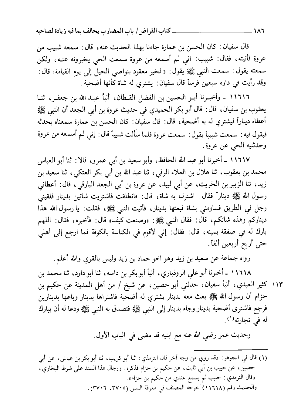 11618 - أَخْبَرَنَا أَبُو عَلِيٍّ الرُّوذْبَارِيُّ، أنبأ أَبُو بَكْرِ بْنُ دَاسَةَ، ثنا أَبُو دَاوُدَ، ثنا مُحَمَّدُ بْنُ كَثِيرٍ الْعَبْدِيُّ، أنبأ سُفْيَانُ، حَدَّثَنِي أَبُو حَصِينٍ، عَنْ شَيْخٍ، مِنْ أَهْلِ الْمَدِينَةِ عَنْ حَكِيمِ بْنِ حِزَامٍ، أَنَّ رَسُولَ اللهِ صَلَّى اللهُ عَلَيْهِ وَسَلَّمَ " §بَعَثَ مَعَهُ بِدِينَارٍ يَشْتَرِي لَهُ أُضْحِيَّةً، فَاشْتَرَاهَا بِدِينَارٍ وَبَاعَهَا بِدِينَارَيْنِ، فَرَجَعَ فَاشْتَرَى أُضْحِيَّةً بِدِينَارٍ وَجَاءَ بِدِينَارٍ إِلَى النَّبِيِّ صَلَّى اللهُ عَلَيْهِ وَسَلَّمَ، فَتَصَدَّقَ بِهِ النَّبِيُّ صَلَّى اللهُ عَلَيْهِ وَسَلَّمَ وَدَعَا لَهُ أَنْ يُبَارَكَ لَهُ فِي تِجَارَتِهِ " وَحَدِيثُ عُمَرَ رَضِيَ اللهُ عَنْهُ مَعَ ابْنَيْهِ قَدْ مَضَى فِي الْبَابِ الْأَوَّلِ