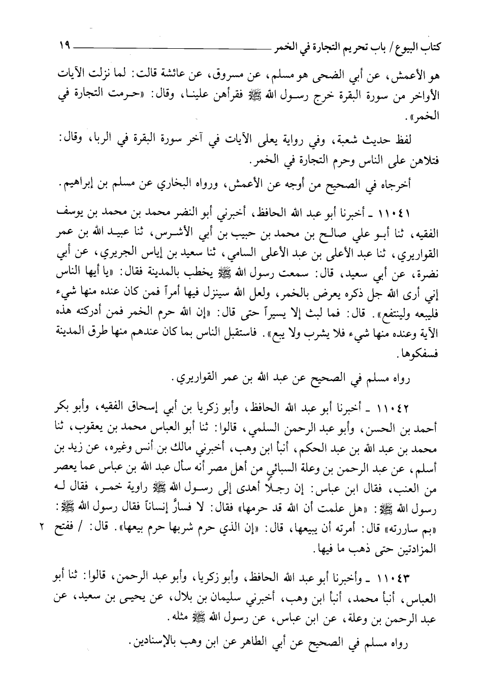 11041 - أَخْبَرَنَا أَبُو عَبْدِ اللهِ الْحَافِظُ، أَخْبَرَنِي أَبُو النَّضْرِ مُحَمَّدُ بْنُ مُحَمَّدِ بْنِ يُوسُفَ الْفَقِيهُ ثنا أَبُو عَلِيٍّ صَالِحُ بْنُ مُحَمَّدِ ابْنِ حُبَيْبَ بْنِ أَبِي الْأَشْرَسِ، ثنا عُبَيْدُ اللهِ بْنُ عُمَرَ الْقَوَارِيرِيُّ، ثنا عَبْدُ الْأَعْلَى بْنُ عَبْدِ الْأَعْلَى السَّامِيُّ، ثنا سَعِيدُ بْنُ إِيَاسٍ الْجُرَيْرِيُّ، عَنْ أَبِي نَضْرَةَ، عَنْ أَبِي سَعِيدٍ قَالَ: سَمِعْتُ رَسُولَ اللهِ صَلَّى اللهُ عَلَيْهِ وَسَلَّمَ يَخْطُبُ بِالْمَدِينَةِ فَقَالَ: " يَا أَيُّهَا النَّاسُ، إِنِّي أَرَى اللهَ جَلَّ ذِكْرُهُ يُعَرِّضُ بِالْخَمْرِ، وَلَعَلَّ اللهَ سَيُنْزِلُ فِيهَا أَمْرًا، فَمَنْ كَانَ عِنْدَهُ مِنْهَا شَيْءٌ فَلْيَبِعْهُ وَلْيَنْتَفِعْ "، قَالَ: فَمَا لَبِثَ إِلَّا يَسِيرًا حَتَّى قَالَ: " إِنَّ اللهَ §حَرَّمَ الْخَمْرَ فَمَنْ أَدْرَكَتْهُ هَذِهِ الْآيَةُ وَعِنْدَهُ مِنْهَا شَيْءٌ فَلَا يَشْرَبْ وَلَا يَبِعْ "، فَاسْتَقْبَلَ النَّاسُ بِمَا كَانَ عِنْدَهُمْ مِنْهَا طُرُقَ الْمَدِينَةِ فَسَفَكُوهَا. رَوَاهُ مُسْلِمٌ فِي الصَّحِيحِ عَنْ عُبَيْدِ اللهِ بْنِ عُمَرَ الْقَوَارِيرِيِّ