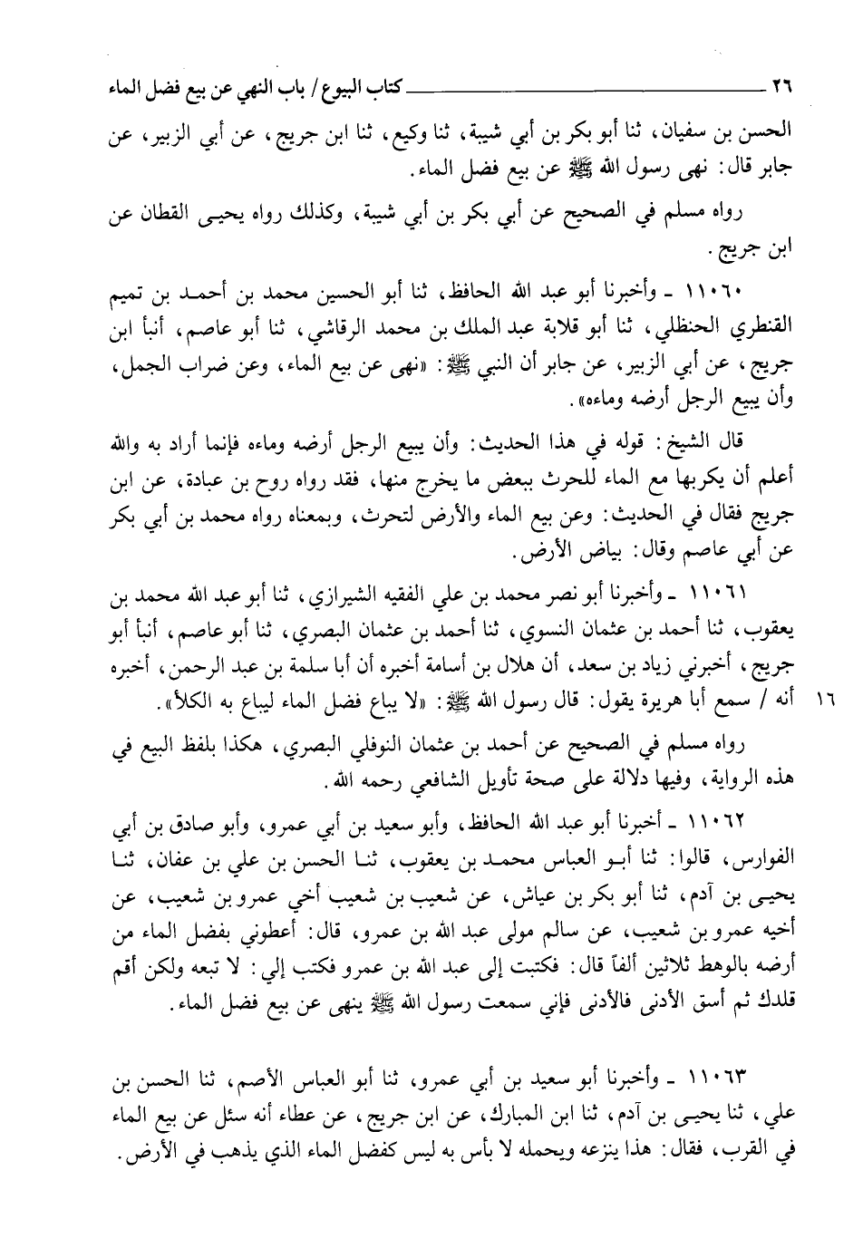 11060 - وَأَخْبَرَنَا أَبُو عَبْدِ اللهِ الْحَافِظُ، ثنا أَبُو الْحُسَيْنِ مُحَمَّدُ بْنُ أَحْمَدَ بْنِ تَمِيمٍ الْقَنْطَرِيُّ الْحَنْظَلِيُّ، ثنا أَبُو قِلَابَةَ عَبْدُ الْمَلِكِ بْنُ مُحَمَّدٍ الرَّقَاشِيُّ، ثنا أَبُو عَاصِمٍ، أنبأ ابْنُ جُرَيْجٍ، عَنْ أَبِي الزُّبَيْرِ، عَنْ جَابِرٍ " أَنَّ النَّبِيَّ صَلَّى اللهُ عَلَيْهِ وَسَلَّمَ §نَهَى عَنْ بَيْعِ الْمَاءِ، وَعَنْ ضِرَابِ الْجَمَلِ، وَأَنْ يَبِيعَ الرَّجُلُ أَرْضَهُ وَمَاءَهُ " قَالَ الشَّيْخُ: قَوْلُهُ فِي هَذَا الْحَدِيثِ: " وَأَنْ يَبِيعَ الرَّجُلُ أَرْضَهُ وَمَاءَهُ "، فَإِنَّمَا أَرَادَ بِهِ وَاللهُ أَعْلَمُ أَنْ يُكْرِيَهَا مَعَ الْمَاءِ لِلْحَرْثِ بِبَعْضِ مَا يَخْرُجُ مِنْهَا، فَقَدْ رَوَاهُ رَوْحُ بْنُ عُبَادَةَ، عَنِ ابْنِ جُرَيْجٍ فَقَالَ فِي الْحَدِيثِ: " وَعَنْ بَيْعِ الْمَاءِ وَالْأَرْضِ لِتُحْرَثَ " وَبِمَعْنَاهُ رَوَاهُ مُحَمَّدُ بْنُ أَبِي بَكْرٍ، عَنْ أَبِي عَاصِمٍ وَقَالَ: بَيَاضِ الْأَرْضِ