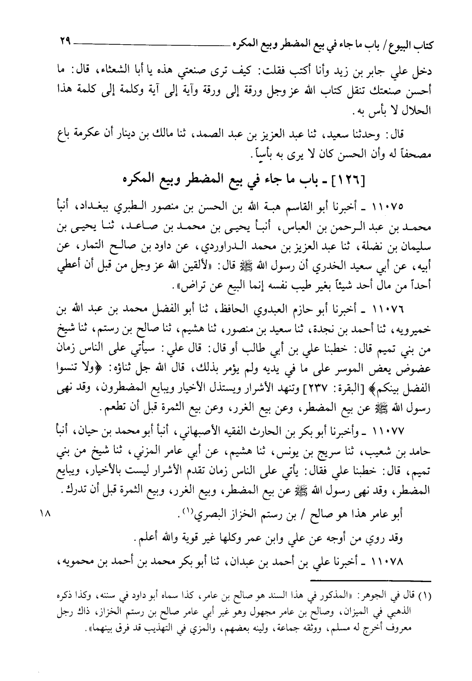 11077 - وَأَخْبَرَنَا أَبُو بَكْرِ بْنُ الْحَارِثِ الْفَقِيهُ الْأَصْبَهَانِيُّ، أنبأ أَبُو مُحَمَّدِ بْنُ حَيَّانَ، أنبأ حَامِدُ بْنُ شُعَيْبٍ، ثنا سُرَيْجُ بْنُ يُونُسَ، ثنا هُشَيْمٌ، عَنْ أَبِي عَامِرٍ الْمُزَنِيِّ، ثنا شَيْخٌ مِنْ بَنِي تَمِيمٍ قَالَ: خَطَبَنَا عَلِيٌّ فَقَالَ: " يَأْتِي عَلَى النَّاسِ زَمَانٌ , تُقَدَّمُ الْأَشْرَارُ لَيْسَتْ بِالْأَخْيَارِ، وَيُبَايِعُ الْمُضْطَرُّ، وَقَدْ §نَهَى رَسُولُ اللهِ صَلَّى اللهُ عَلَيْهِ وَسَلَّمَ عَنْ بَيْعِ الْمُضْطَرِّ، وَبَيْعِ الْغَرَرِ، وَبَيْعِ الثَّمَرَةِ قَبْلَ أَنْ تُدْرِكَ " أَبُو عَامِرٍ هَذَا هُوَ صَالِحُ بْنُ رُسْتُمَ الْخَزَّازُ الْبَصْرِيُّ، وَقَدْ رُوِيَ مِنْ أَوْجُهٍ عَنْ عَلِيٍّ وَابْنِ عُمَرَ، وَكُلُّهَا غَيْرُ قَوِيَّةٍ، وَاللهُ أَعْلَمُ