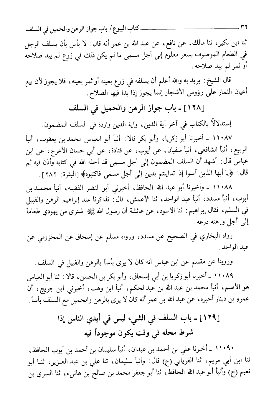 11089 - أَخْبَرَنَا أَبُو زَكَرِيَّا بْنُ أَبِي إِسْحَاقَ، وَأَبُو بَكْرِ بْنُ الْحَسَنِ، قَالَا: ثنا أَبُو الْعَبَّاسِ هُوَ الْأَصَمُّ، أنبأ مُحَمَّدُ بْنُ عَبْدِ اللهِ بْنِ عَبْدِ الْحَكَمِ، أنبأ ابْنُ وَهْبٍ، أَخْبَرَنِي ابْنُ جُرَيْجٍ، أَنَّ عَمْرَو بْنَ دِينَارٍ أَخْبَرَهُ، عَنْ عَبْدِ اللهِ بْنِ عُمَرَ " أَنَّهُ كَانَ §لَا يَرَى بِالرَّهْنِ وَالْحَمِيلِ مَعَ السَّلَفِ بَأْسًا "