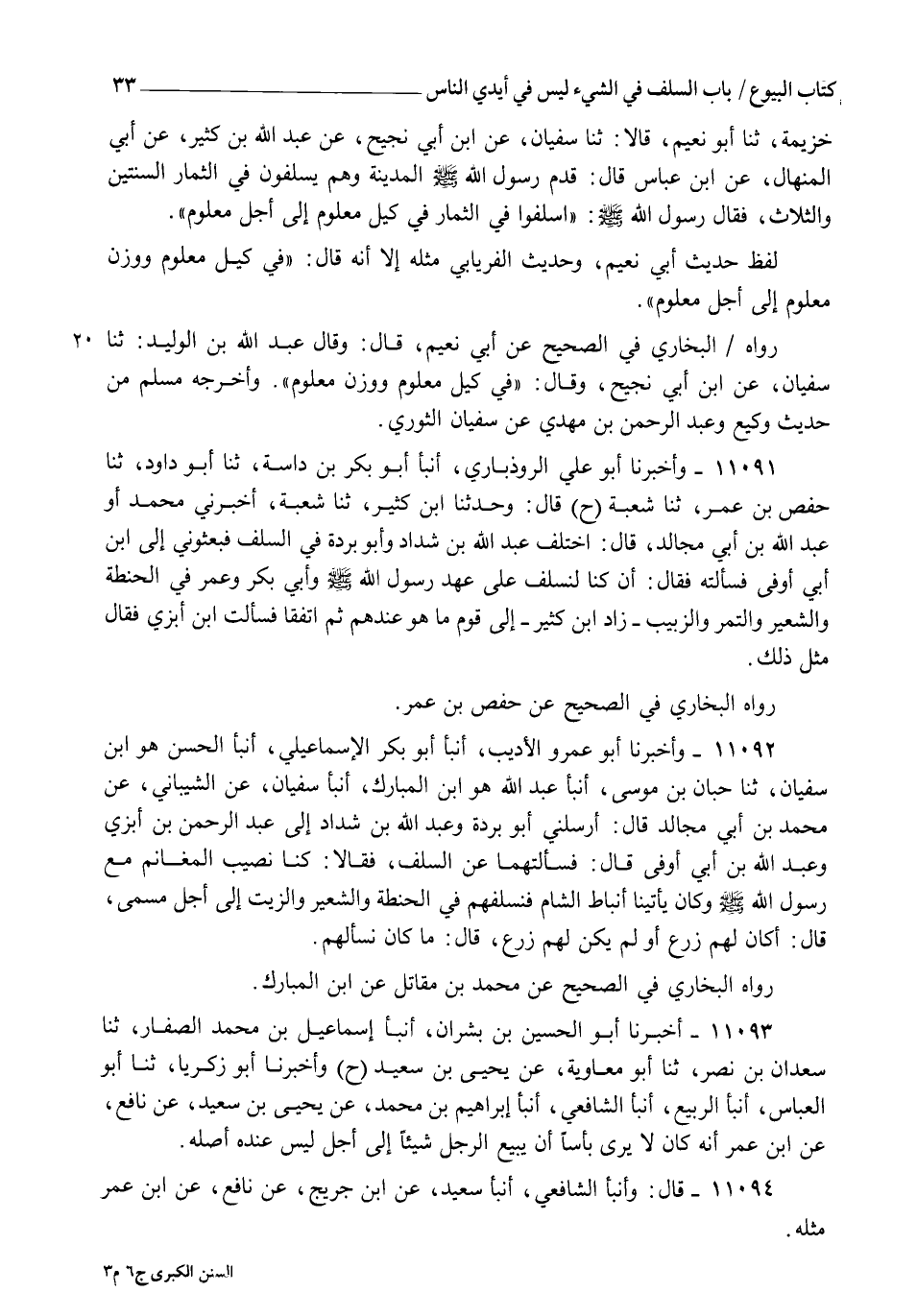 11092 - وَأَخْبَرَنَا أَبُو عَمْرٍو الْأَدِيبُ، أنبأ أَبُو بَكْرٍ الْإِسْمَاعِيلِيُّ، أنبأ الْحَسَنُ هُوَ ابْنُ سُفْيَانَ، ثنا حِبَّانُ بْنُ مُوسَى، أنبأ عَبْدُ اللهِ هُوَ ابْنُ الْمُبَارَكِ، أنبأ سُفْيَانُ، عَنِ الشَّيْبَانِيِّ، عَنْ مُحَمَّدِ بْنِ أَبِي مُجَالِدٍ قَالَ: أَرْسَلَنِي أَبُو بُرْدَةَ وَعَبْدُ اللهِ بْنُ شَدَّادٍ إِلَى عَبْدِ الرَّحْمَنِ بْنِ أَبْزَى وَعَبْدِ اللهِ بْنِ أَبِي أَوْفَى، قَالَ: فَسَأَلْتُهُمَا عَنِ السَّلَفِ، فَقَالَا: " كُنَّا نُصِيبُ الْمَغَانِمَ مَعَ رَسُولِ اللهِ صَلَّى اللهُ عَلَيْهِ وَسَلَّمَ، وَكَانَ يَأْتِينَا أَنْبَاطُ الشَّامِ §فَنُسْلِفُهُمْ فِي الْحِنْطَةِ وَالشَّعِيرِ وَالزَّيْتِ إِلَى أَجَلٍ مُسَمًّى، قَالَ: أَكَانَ لَهُمْ زَرْعٌ، أَوْ لَمْ يَكُنْ لَهُمْ زَرْعٌ؟ قَالَ: مَا كُنَّا نَسْأَلُهُمْ " رَوَاهُ الْبُخَارِيُّ فِي الصَّحِيحِ عَنْ مُحَمَّدِ بْنِ مُقَاتِلٍ، عَنِ ابْنِ الْمُبَارَكِ