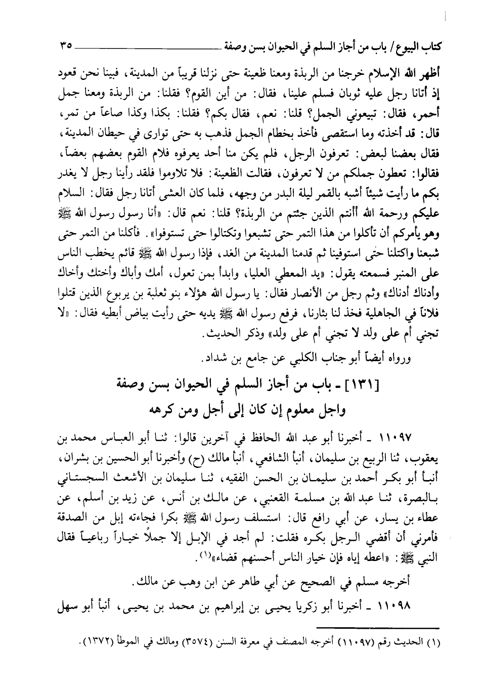 11097 - أَخْبَرَنَا أَبُو عَبْدِ اللهِ الْحَافِظُ فِي آخَرِينَ، قَالُوا: ثنا أَبُو الْعَبَّاسِ مُحَمَّدُ بْنُ يَعْقُوبَ، ثنا الرَّبِيعُ بْنُ سُلَيْمَانَ، أنبأ الشَّافِعِيُّ، أنبأ مَالِكٌ، ح وَأَخْبَرَنَا أَبُو الْحُسَيْنِ بْنُ بِشْرَانَ، أنبأ أَبُو بَكْرٍ أَحْمَدُ بْنُ سَلْمَانَ بْنِ الْحَسَنِ الْفَقِيهُ، ثنا سُلَيْمَانُ بْنُ الْأَشْعَثِ السِّجِسْتَانِيُّ بِالْبَصْرَةِ، ثنا عَبْدُ اللهِ بْنُ مَسْلَمَةَ الْقَعْنَبِيُّ، عَنْ مَالِكِ بْنِ أَنَسٍ، عَنْ زَيْدِ بْنِ أَسْلَمَ، عَنْ عَطَاءِ بْنِ يَسَارٍ، عَنْ أَبِي رَافِعٍ قَالَ: §اسْتَسْلَفَ رَسُولُ اللهِ صَلَّى اللهُ عَلَيْهِ وَسَلَّمَ بَكْرًا، فَجَاءَتْهُ إِبِلٌ مِنَ الصَّدَقَةِ، فَأَمَرَنِي أَنْ أَقْضِيَ الرَّجُلَ بَكْرَهُ، فَقُلْتُ: لَمْ أَجِدْ فِي الْإِبِلِ إِلَّا جَمَلًا خِيَارًا رَبَاعِيًّا، فَقَالَ النَّبِيُّ صَلَّى اللهُ عَلَيْهِ وَسَلَّمَ: " أَعْطِهِ إِيَّاهُ؛ فَإِنَّ خِيَارَ النَّاسِ أَحْسَنُهُمْ قَضَاءً " أَخْرَجَهُ مُسْلِمٌ فِي الصَّحِيحِ عَنْ أَبِي طَاهِرٍ، عَنِ ابْنِ وَهْبٍ، عَنْ مَالِكٍ