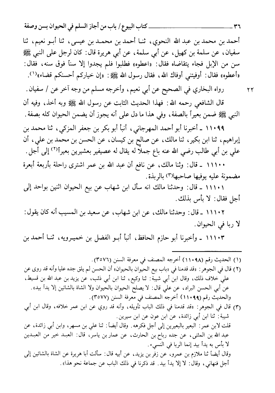 11099 - أَخْبَرَنَا أَبُو أَحْمَدَ الْمِهْرَجَانِيُّ، أنبأ أَبُو بَكْرِ بْنُ جَعْفَرٍ الْمُزَكِّي، ثنا مُحَمَّدُ بْنُ إِبْرَاهِيمَ، ثنا ابْنُ بُكَيْرٍ، ثنا مَالِكٌ، عَنْ صَالِحِ بْنِ كَيْسَانَ، عَنِ الْحَسَنِ بْنِ مُحَمَّدِ بْنِ عَلِيٍّ، أَنَّ عَلِيَّ بْنَ أَبِي طَالِبٍ رَضِيَ اللهُ عَنْهُ " §بَاعَ جَمَلًا لَهُ، يُقَالُ لَهُ: عُصَيْفِيرٌ، بِعِشْرِينَ بَعِيرًا إِلَى أَجَلٍ "