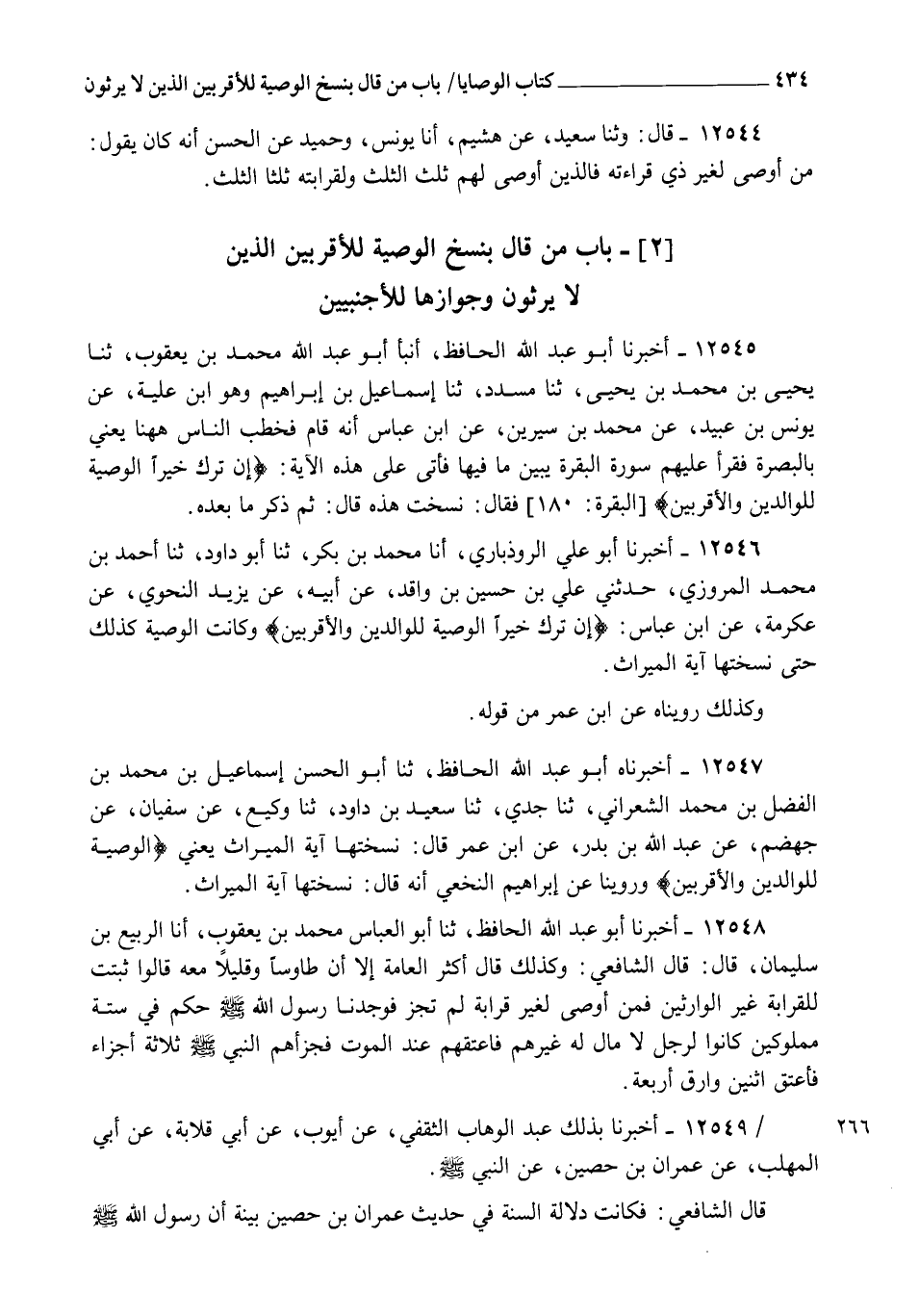 12545 - أَخْبَرَنَا أَبُو عَبْدِ اللهِ الْحَافِظُ , أنبأ أَبُو عَبْدِ اللهِ مُحَمَّدُ بْنُ يَعْقُوبَ، ثنا يَحْيَى بْنُ مُحَمَّدِ بْنِ يَحْيَى , ثنا مُسَدَّدٌ , ثنا إِسْمَاعِيلُ بْنُ إِبْرَاهِيمَ وَهُوَ ابْنُ عُلَيَّةَ، عَنْ يُونُسَ بْنِ عُبَيْدٍ , عَنْ مُحَمَّدِ بْنِ سِيرِينَ , عَنِ ابْنِ عَبَّاسٍ , أَنَّهُ قَامَ فَخَطَبَ النَّاسَ هَا هُنَا، يَعْنِي بِالْبَصْرَةِ، فَقَرَأَ عَلَيْهِمْ سُورَةَ الْبَقَرَةِ يُبَيِّنُ مَا فِيهَا، فَأَتَى عَلَى هَذِهِ الْآيَةِ {إِنْ تَرَكَ خَيْرًا §الْوَصِيَّةُ لِلْوَالِدَيْنِ وَالْأَقْرَبِينَ} [البقرة: 180]، فَقَالَ: " نُسِخَتْ هَذِهِ "، قَالَ: ثُمَّ ذَكَرَ مَا بَعْدَهُ