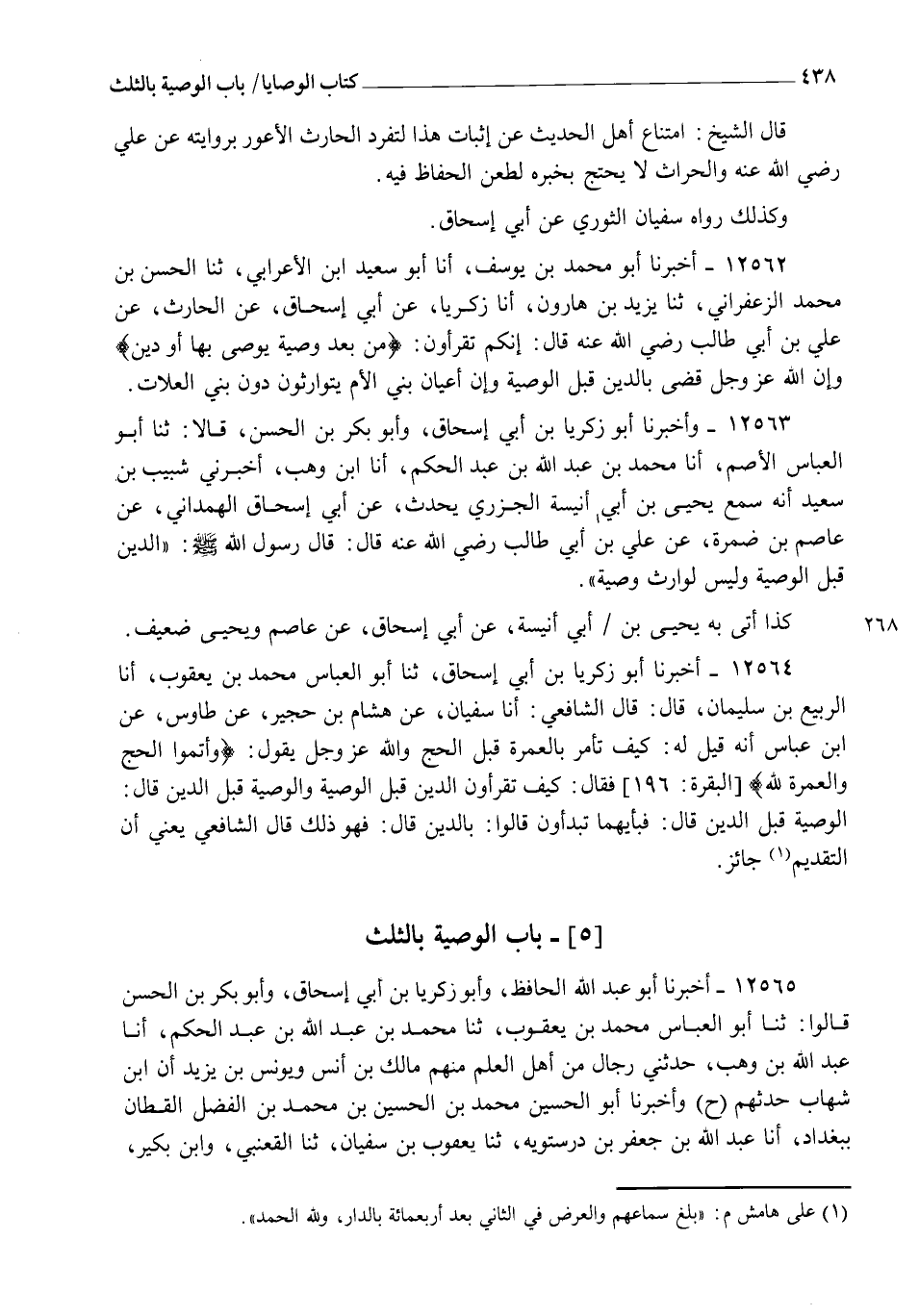12563 - وَأَخْبَرَنَا أَبُو زَكَرِيَّا بْنُ أَبِي إِسْحَاقَ , وَأَبُو بَكْرِ بْنُ الْحَسَنِ، قَالَا: ثنا أَبُو الْعَبَّاسِ الْأَصَمُّ , أنا مُحَمَّدُ بْنُ عَبْدِ اللهِ بْنِ عَبْدِ الْحَكَمِ , أنا ابْنُ وَهْبٍ , أَخْبَرَنِي شَبِيبُ بْنُ سَعِيدٍ , أَنَّهُ سَمِعَ يَحْيَى بْنَ أَبِي أُنَيْسَةَ الْجَزَرِيَّ يُحَدِّثُ، عَنْ أَبِي إِسْحَاقَ الْهَمْدَانِيِّ , عَنْ عَاصِمِ بْنِ ضَمْرَةَ , عَنْ عَلِيِّ بْنِ أَبِي طَالِبٍ رَضِيَ اللهُ عَنْهُ قَالَ: قَالَ رَسُولُ اللهِ صَلَّى اللهُ عَلَيْهِ وَسَلَّمَ: " §الدَّيْنُ قَبْلَ الْوَصِيَّةِ، وَلَيْسَ لِوَارِثٍ وَصِيَّةٌ " كَذَا أَتَى بِهِ يَحْيَى بْنُ أَبِي أُنَيْسَةَ عَنْ أَبِي إِسْحَاقَ، عَنْ عَاصِمٍ , وَيَحْيَى ضَعِيفٌ