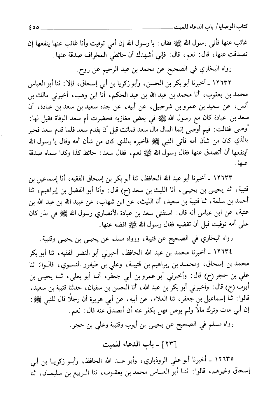 12634 - أَخْبَرَنَا مُحَمَّدُ بْنُ عَبْدِ اللهِ الْحَافِظُ , أَخْبَرَنِي أَبُو النَّضْرِ الْفَقِيهُ , ثنا أَبُو بَكْرٍ مُحَمَّدُ بْنُ إِسْحَاقَ , وَمُحَمَّدُ بْنُ إِبْرَاهِيمَ بْنِ قُتَيْبَةَ , وَعَلِيُّ بْنُ طَيْفُورٍ النَّسَوِيُّ قَالُوا: ثنا عَلِيُّ بْنُ حُجْرٍ، ح قَالَ: وَأَخْبَرَنِي أَبُو عَمْرِو بْنُ أَبِي جَعْفَرٍ , أنا أَبُو يَعْلَى , ثنا يَحْيَى بْنُ أَيُّوبَ، ح قَالَ: وَأَخْبَرَنِي أَبُو بَكْرِ بْنُ عَبْدِ اللهِ , أنا الْحَسَنُ بْنُ سُفْيَانَ , حَدَّثَنَا قُتَيْبَةُ بْنُ سَعِيدٍ، قَالُوا: ثنا إِسْمَاعِيلُ بْنُ جَعْفَرٍ , ثنا الْعَلَاءُ , عَنْ أَبِيهِ , عَنْ أَبِي هُرَيْرَةَ، أَنَّ رَجُلًا قَالَ لِلنَّبِيِّ صَلَّى اللهُ عَلَيْهِ وَسَلَّمَ: إِنَّ §أَبِي مَاتَ وَتَرَكَ مَالًا وَلَمْ يُوصِ، فَهَلْ يُكَفِّرُ عَنْهُ أَنْ أَتَصَدَّقَ عَنْهُ؟ قَالَ: " نَعَمْ " رَوَاهُ مُسْلِمٌ فِي الصَّحِيحِ عَنْ يَحْيَى بْنِ أَيُّوبَ وَقُتَيْبَةَ وَعَلِيِّ بْنِ حُجْرٍ