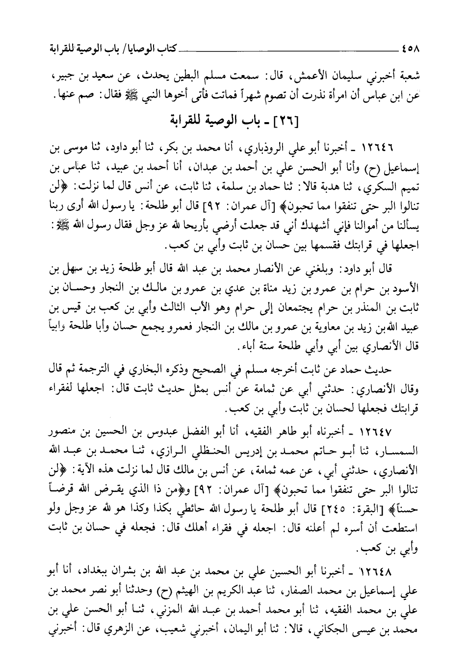 12646 - أَخْبَرَنَا أَبُو عَلِيٍّ الرُّوذْبَارِيُّ , أنا مُحَمَّدُ بْنُ بَكْرٍ , ثنا أَبُو دَاوُدَ , ثنا مُوسَى بْنُ إِسْمَاعِيلَ ح وَأنا أَبُو الْحَسَنِ عَلِيُّ بْنُ أَحْمَدَ بْنِ عَبْدَانَ، أنا أَحْمَدُ بْنُ عُبَيْدٍ , ثنا عَبَّاسُ بْنُ تَمِيمٍ السُّكَّرِيُّ , ثنا هُدْبَةُ، قَالَا: ثنا حَمَّادُ بْنُ سَلَمَةَ , ثنا ثَابِتٌ , عَنْ أَنَسٍ قَالَ: لَمَّا نَزَلَتْ {لَنْ تَنَالُوا الْبِرَّ حَتَّى تُنْفِقُوا مِمَّا تُحِبُّونَ} [آل عمران: 92] قَالَ أَبُو طَلْحَةَ: يَا رَسُولَ اللهِ، أَرَى رَبَّنَا يَسْأَلُنَا مِنْ أَمْوَالِنَا؛ فَإِنِّي أُشْهِدُكَ أَنِّي قَدْ جَعَلْتُ أَرْضِي بِأَرِيحَا لِلَّهِ عَزَّ وَجَلَّ، فَقَالَ رَسُولُ اللهِ صَلَّى اللهُ عَلَيْهِ وَسَلَّمَ: §" اجْعَلْهَا فِي قَرَابَتِكَ " فَقَسَمَهَا بَيْنَ حَسَّانَ بْنِ ثَابِتٍ وَأُبِيِّ بْنِ كَعْبٍ. قَالَ أَبُو دَاوُدَ: وَبَلَغَنِي عَنِ الْأَنْصَارِيِّ مُحَمَّدِ بْنِ عَبْدِ اللهِ قَالَ: أَبُو طَلْحَةَ زَيْدُ بْنُ سَهْلِ بْنِ الْأَسْوَدِ بْنِ حَرَامِ بْنِ عَمْرِو بْنِ زَيْدِ مَنَاةَ بْنِ عَدِيِّ بْنِ عَمْرِو بْنِ مَالِكِ بْنِ النَّجَّارِ , وَحَسَّانُ بْنُ ثَابِتِ بْنِ الْمُنْذِرِ بْنِ حَرَامٍ، يَجْتَمِعَانِ إِلَى حَرَامٍ، وَهُوَ الْأَبُ الثَّالِثُ، وَأُبِيُّ بْنُ كَعْبِ بْنِ قَيْسِ بْنِ عُبَيْدِ اللهِ بْنِ زَيْدِ بْنِ مُعَاوِيَةَ بْنِ عَمْرِو بْنِ مَالِكِ بْنِ النَّجَّارِ , فَعَمْرٌو يَجْمَعُ حَسَّانَ وَأَبَا طَلْحَةَ وَأُبَيًّا. قَالَ الْأَنْصَارِيُّ: بَيْنَ أُبَيٍّ وَأَبِي طَلْحَةَ سِتَّةُ آبَاءٍ. حَدِيثُ حَمَّادٍ عَنْ ثَابِتٍ أَخْرَجَهُ مُسْلِمٌ فِي الصَّحِيحِ , وَذَكَرَهُ الْبُخَارِيُّ فِي التَّرْجَمَةِ ثُمَّ قَالَ: وَقَالَ الْأَنْصَارِيُّ: حَدَّثَنِي أَبِي، عَنْ ثُمَامَةَ، عَنْ أَنَسٍ بِمِثْلِ حَدِيثِ ثَابِتٍ، قَالَ: " اجْعَلْهَا لِفُقَرَاءِ قَرَابَتِكَ " فَجَعَلَهَا لِحَسَّانَ بْنِ ثَابِتٍ وَأُبِيِّ بْنِ كَعْبٍ