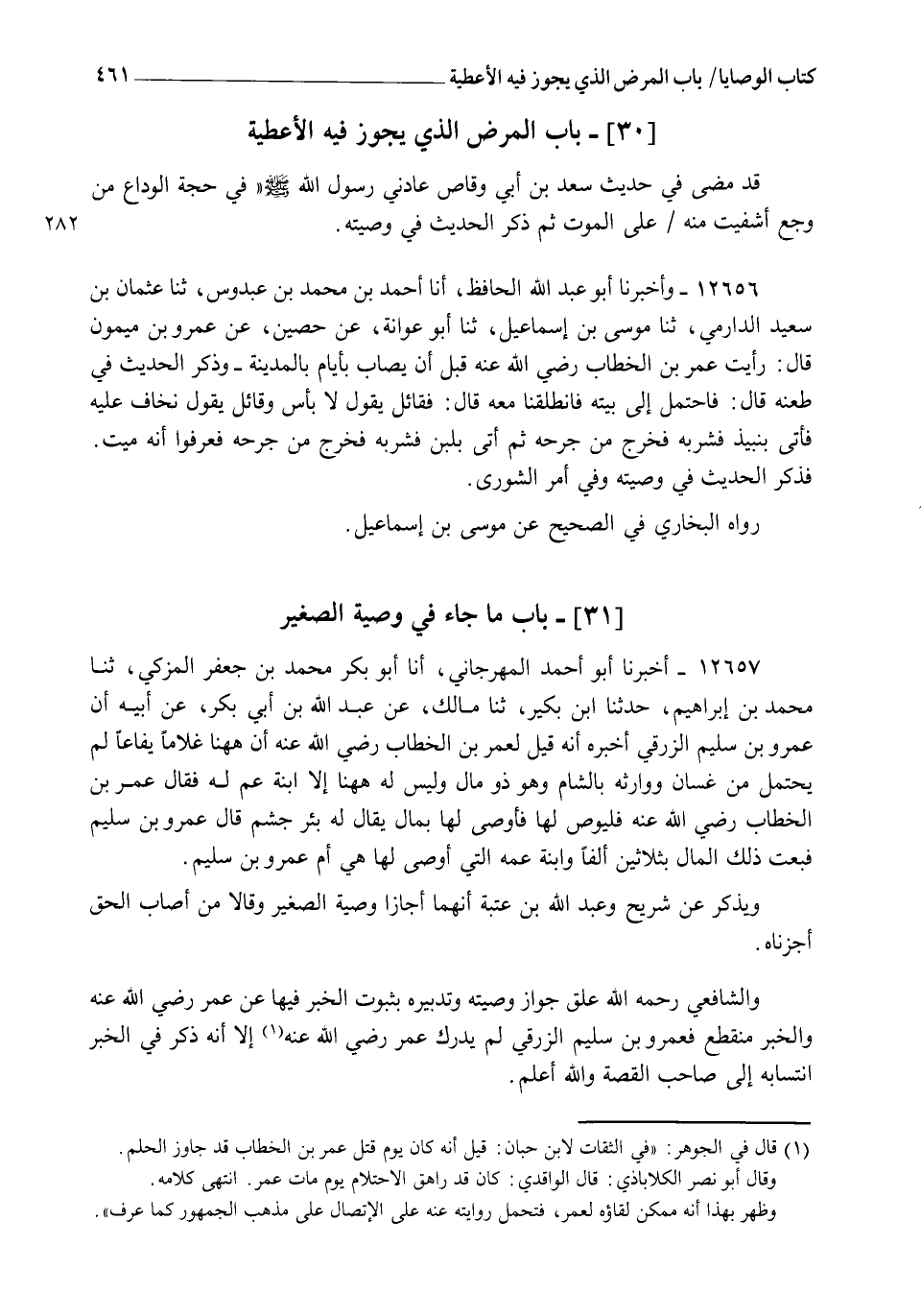 12657 - أَخْبَرَنَا أَبُو أَحْمَدَ الْمِهْرَجَانِيُّ , أنا أَبُو بَكْرٍ مُحَمَّدُ بْنُ جَعْفَرٍ الْمُزَكِّي، ثنا مُحَمَّدُ بْنُ إِبْرَاهِيمَ , حَدَّثَنَا ابْنُ بُكَيْرٍ , ثنا مَالِكٌ , عَنْ عَبْدِ اللهِ بْنِ أَبِي بَكْرٍ , عَنْ أَبِيهِ , أَنَّ عَمْرَو بْنَ سُلَيْمٍ الزُّرَقِيَّ أَخْبَرَهُ، أَنَّهُ قِيلَ لِعُمَرَ بْنِ الْخَطَّابِ رَضِيَ اللهُ عَنْهُ: إِنَّ هَا هُنَا غُلَامًا يَفَاعًا لَمْ يَحْتَلِمْ مِنْ غَسَّانَ، وَوَارِثُهُ بِالشَّامِ وَهُوَ ذُو مَالٍ، وَلَيْسَ لَهُ هَا هُنَا إِلَّا ابْنَةُ عَمٍّ لَهُ , فَقَالَ عُمَرُ بْنُ الْخَطَّابِ رَضِيَ اللهُ عَنْهُ: " §فَلْيُوصِ لَهَا " , فَأَوْصَى لَهَا بِمَالٍ يُقَالُ لَهُ: بِئْرُ جُشَمَ قَالَ عَمْرُو بْنُ سُلَيْمٍ: فَبِعْتُ ذَلِكَ الْمَالَ بِثَلَاثِينَ أَلْفًا وَابْنَةُ عَمِّهِ الَّتِي أَوْصَى لَهَا هِيَ أُمُّ عَمْرِو بْنُ سُلَيْمٍ وَيُذْكَرُ عَنْ شُرَيْحٍ وَعَبْدِ اللهِ بْنِ عُتْبَةَ أَنَّهُمَا أَجَازَا وَصِيَّةَ الصَّغِيرِ، وَقَالَا: مَنْ أَصَابَ الْحَقَّ أَجَزْنَاهُ وَالشَّافِعِيُّ رَحِمَهُ اللهُ عَلَّقَ جَوَازَ وَصِيَّتِهِ وَتَدْبِيرِهِ بِثِبُوتِ الْخَبَرِ فِيهَا عَنْ عُمَرَ رَضِيَ اللهُ عَنْهُ، وَالْخَبَرُ مُنْقَطِعٌ؛ فَعَمْرُو بْنُ سُلَيْمٍ الزُّرَقِيُّ لَمْ يُدْرِكْ عُمَرَ رَضِيَ اللهُ عَنْهُ، إِلَّا أَنَّهُ ذَكَرَ فِي الْخَبَرِ انْتِسَابَهُ إِلَى صَاحِبِ الْقِصَّةِ وَاللهُ أَعْلَمُ