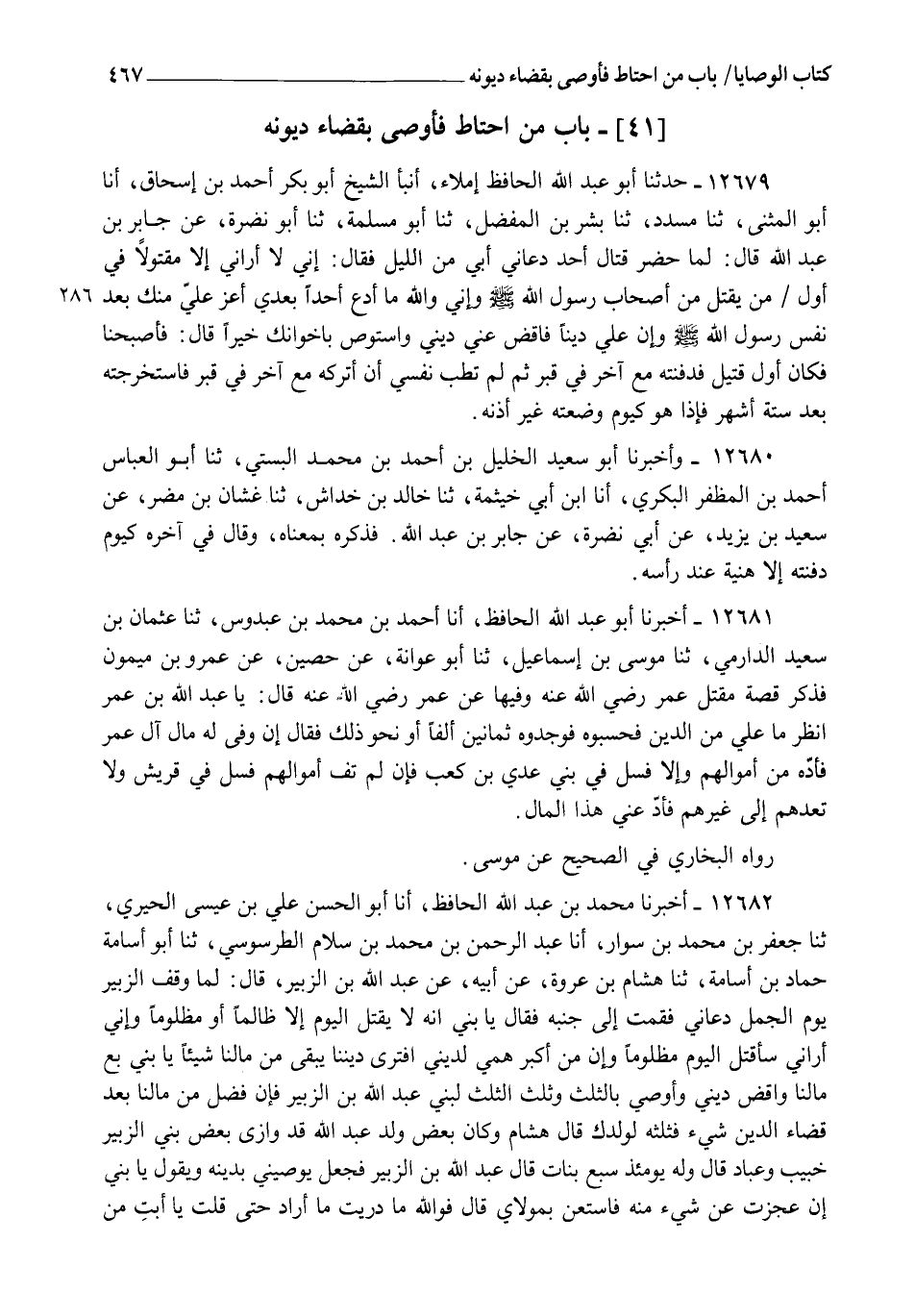 12682 - أَخْبَرَنَا مُحَمَّدُ بْنُ عَبْدِ اللهِ الْحَافِظُ , أنا أَبُو الْحَسَنِ عَلِيُّ بْنُ عِيسَى الْحِيرِيُّ، ثنا جَعْفَرُ بْنُ مُحَمَّدِ بْنِ سَوَّارٍ , أنا عَبْدُ الرَّحْمَنِ بْنُ مُحَمَّدِ بْنِ سَلَّامٍ الطَّرَسُوسِيُّ , ثنا أَبُو أُسَامَةَ حَمَّادُ بْنُ أُسَامَةَ , ثنا هِشَامُ بْنُ عُرْوَةَ , عَنْ أَبِيهِ , عَنْ عَبْدِ اللهِ بْنِ الزُّبَيْرِ قَالَ: لَمَّا وَقَفَ الزُّبَيْرُ يَوْمَ الْجَمَلِ دَعَانِي، فَقُمْتُ إِلَى جَنْبِهِ، فَقَالَ: " يَا بُنِيَّ، إِنَّهُ §لَا يُقْتَلُ الْيَوْمَ إِلَّا ظَالِمٌ أَوْ مَظْلُومٌ , وَإِنِّي أَرَانِي سَأُقْتَلُ الْيَوْمَ مَظْلُومًا , وَإِنَّ مِنْ أَكْبَرِ هَمِّي لَدَيْنِي , أَفَتُرَى دَيْنُنَا يُبْقِي مِنْ مَالِنَا شَيْئًا؟ يَا بُنِيَّ، بِعْ مَالَنَا وَاقْضِ دَيْنِي , وَأَوْصِ بِالثُّلُثِ، وَثَلِّثِ الثُّلُثَ لِبَنِي عَبْدِ اللهِ بْنِ الزُّبَيْرِ، فَإِنْ فَضَلَ مِنْ مَالِنَا بَعْدَ قَضَاءِ الدَّيْنِ شَيْءٌ فَثُلُثُهُ لِوَلَدِكَ ". قَالَ هِشَامٌ: وَكَانَ بَعْضُ وَلَدِ عَبْدِ اللهِ قَدْ وَازَى بَعْضَ بَنِي الزُّبَيْرِ، خُبَيْبٌ وَعَبَّادٌ، قَالَ: وَلَهُ يَوْمَئِذٍ سَبْعُ بَنَاتٍ، قَالَ عَبْدُ اللهِ بْنُ الزُّبَيْرِ: فَجَعَلَ يُوصِينِي بِدَيْنِهِ وَيَقُولُ: يَا بُنَيَّ، إِنْ عَجَزْتَ عَنْ شَيْءٍ مِنْهُ فَاسْتَعِنْ بِمَوْلَايَ، قَالَ: فَوَاللهِ مَا دَرَيْتُ مَا أَرَادَ حَتَّى قُلْتُ: يَا أَبَتِ، مَنْ -[468]- مَوْلَاكَ؟ قَالَ: " اللهُ "، قَالَ: فَوَاللهِ مَا وَقَعْتُ فِي كُرْبَةٍ مِنْ دَيْنِهِ إِلَّا قُلْتُ: يَا مَوْلَى الزُّبَيْرِ، اقْضِ عَنْهُ، فَيَقْضِيَهُ، قَالَ: وَقُتِلَ الزُّبَيْرُ وَلَمْ يَدَعْ دِينَارًا وَلَا دِرْهَمًا إِلَّا أَرَضِينَ، مِنْهَا الْغَابَةُ، وَأَحَدَ عَشَرَ دَارًا بِالْمَدِينَةِ، وَدَارَيْنِ بِالْبَصْرَةِ، وَدَارًا بِالْكُوفَةِ، وَدَارًا بِمِصْرَ، قَالَ: وَإِنَّمَا كَانَ دَيْنُهُ الَّذِي عَلَيْهِ مِنَ الدَّيْنِ أَنَّ الرَّجُلَ كَانَ يَأْتِيهِ بِالْمَالِ فَيَسْتَوْدِعُهُ إِيَّاهُ، فَيَقُولُ الزُّبَيْرُ: " لَا , وَلَكِنْ هُوَ سَلَفٌ؛ إِنِّي أَخْشَى عَلَيْهِ الضَّيْعَةَ , وَمَا وَلِيَ إِمَارَةً قَطُّ، وَلَا جِبَايَةً، وَلَا خَرَاجًا، وَلَا شَيْئًا قَطُّ إِلَّا أَنْ يَكُونَ فِي غَزْوَةٍ مَعَ رَسُولِ اللهِ صَلَّى اللهُ عَلَيْهِ وَسَلَّمَ وَمَعَ أَبِي بَكْرٍ وَعُمَرَ وَعُثْمَانَ رَضِيَ اللهُ عَنْهُمْ " قَالَ عَبْدُ اللهِ بْنُ الزُّبَيْرِ: فَحَسَبْتُ مَا عَلَيْهِ مِنَ الدَّيْنِ فَوَجَدْتُهُ أَلْفَيْ أَلْفٍ وَمِائَتَيْ أَلْفٍ، قَالَ: فَلَقِيَ حَكِيمُ بْنُ حِزَامٍ عَبْدَ اللهِ بْنَ الزُّبَيْرِ فَقَالَ: يَا ابْنَ أَخِي، كَمْ عَلَى أَخِي مِنَ الدَّيْنِ؟ قَالَ: فَكَتَمَ وَقَالَ: مِائَةُ أَلْفٍ، قَالَ حَكِيمٌ: مَا أَرَى أَمْوَالَكُمْ تَسَعُ لِهَذِهِ، قَالَ: فَقَالَ لَهُ عَبْدُ اللهِ: أَفَرَأَيْتُكَ إِنْ كَانَتْ أَلْفَيْ أَلْفٍ وَمِائَتَيْ أَلْفٍ؟ قَالَ: مَا أَرَاكُمْ تُطِيقُونَ هَذَا، فَإِنْ عَجَزْتُمْ عَنْ شَيْءٍ فَاسْتَعِينُونِي، قَالَ: وَكَانَ الزُّبَيْرُ اشْتَرَى الْغَابَةَ بِسَبْعِينَ وَمِائَةِ أَلْفٍ، وَبَاعَهَا عَبْدُ اللهِ بْنُ الزُّبَيْرِ بِأَلْفِ أَلْفٍ وَسِتِّمِائَةِ أَلْفٍ , ثُمَّ قَامَ فَقَالَ: مَنْ كَانَ لَهُ عَلَى الزُّبَيْرِ دَيْنٌ فَلْيُوَافِنَا بِالْغَابَةِ، قَالَ: فَأَتَاهُ عَبْدُ اللهِ بْنُ جَعْفَرٍ، وَكَانَ لَهُ عَلَى الزُّبَيْرِ أَرْبَعُمِائَةِ أَلْفٍ، فَقَالَ لِعَبْدِ اللهِ بْنِ الزُّبَيْرِ: إِنْ شِئْتُمْ تَرَكْنَاهَا لَكُمْ، قَالَ عَبْدُ اللهِ: لَا، قَالَ: فَإِنْ شِئْتُمْ جَعَلْتُمُوهَا فِيمَا تُؤَخِّرُونَ إِنْ أَخَّرْتُمْ شَيْئًا، فَقَالَ عَبْدُ اللهِ: لَا، قَالَ: فَاقْطَعُوا لِي قِطْعَةً، قَالَ: عَبْدُ اللهِ: لَكَ 