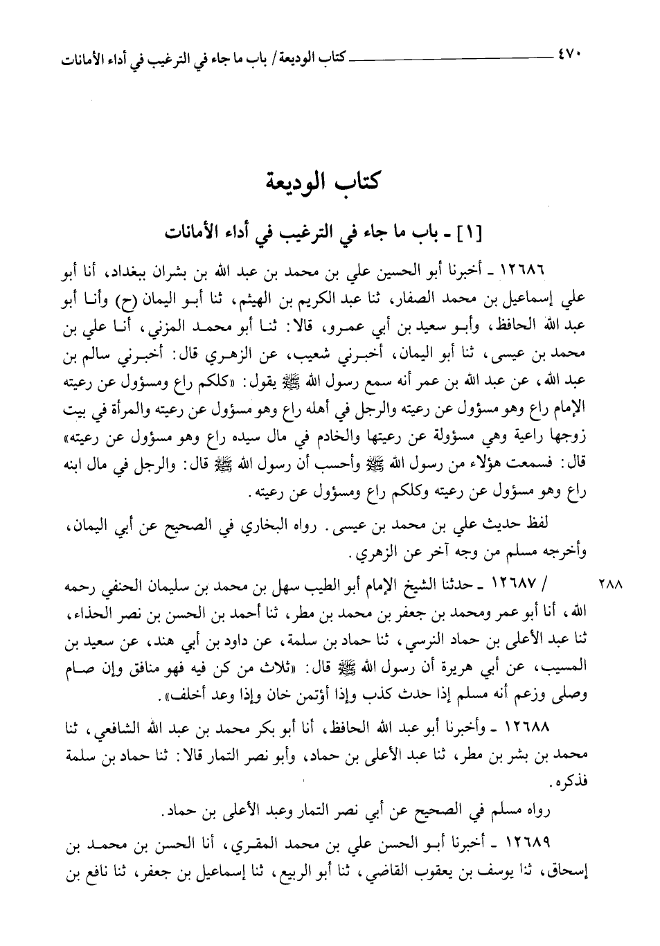 12686 - أَخْبَرَنَا أَبُو الْحُسَيْنِ عَلِيُّ بْنُ مُحَمَّدِ بْنِ عَبْدِ اللهِ بْنِ بِشْرَانَ بِبَغْدَادَ، أنا أَبُو عَلِيٍّ إِسْمَاعِيلُ بْنُ مُحَمَّدٍ الصَّفَّارُ، ثنا عَبْدُ الْكَرِيمِ بْنُ الْهَيْثَمِ , ثنا أَبُو الْيَمَانِ ح وَأنا أَبُو عَبْدِ اللهِ الْحَافِظُ , وَأَبُو سَعِيدِ بْنُ أَبِي عَمْرٍو، قَالَا: ثنا أَبُو مُحَمَّدٍ الْمُزَنِيُّ , أنا عَلِيُّ بْنُ مُحَمَّدِ بْنِ عِيسَى , ثنا أَبُو الْيَمَانِ , أَخْبَرَنِي شُعَيْبٌ , عَنِ الزُّهْرِيِّ قَالَ: أَخْبَرَنِي سَالِمُ بْنُ عَبْدِ اللهِ , عَنْ عَبْدِ اللهِ بْنِ عُمَرَ , أَنَّهُ سَمِعَ رَسُولَ اللهِ صَلَّى اللهُ عَلَيْهِ وَسَلَّمَ يَقُولُ: " §كُلُّكُمْ رَاعٍ، وَمَسْؤُولٌ عَنْ رَعِيَّتِهِ , الْإِمَامُ رَاعٍ وَهُوَ مَسْؤُولٌ عَنْ رَعِيَّتِهِ , وَالرَّجُلُ فِي أَهْلِهِ رَاعٍ وَهُوَ مَسْؤُولٌ عَنْ رَعِيَّتِهِ , وَالْمَرْأَةُ فِي بَيْتِ زَوْجِهَا رَاعِيَةٌ وَهِيَ مَسْؤُولَةٌ عَنْ رَعِيَّتِهَا , وَالْخَادِمُ فِي مَالِ سَيِّدِهِ رَاعٍ وَهُوَ مَسْؤُولٌ عَنْ رَعِيَّتِهِ ". قَالَ: فَسَمِعْتُ هَؤُلَاءِ مِنْ رَسُولِ اللهِ صَلَّى اللهُ عَلَيْهِ وَسَلَّمَ، وَأَحْسَبُ أَنَّ رَسُولَ اللهِ صَلَّى اللهُ عَلَيْهِ وَسَلَّمَ قَالَ: " وَالرَّجُلُ فِي مَالِ ابْنِهِ رَاعٍ وَهُوَ مَسْؤُولٌ عَنْ رَعِيَّتِهِ , وَكُلُّكُمْ رَاعٍ وَمَسْؤُولٌ عَنْ رَعِيَّتِهِ " لَفْظُ حَدِيثِ عَلِيِّ بْنِ مُحَمَّدِ بْنِ عِيسَى رَوَاهُ الْبُخَارِيُّ فِي الصَّحِيحِ عَنْ أَبِي الْيَمَانِ , وَأَخْرَجَهُ مُسْلِمٌ مِنْ وَجْهٍ آخَرَ عَنِ الزُّهْرِيِّ