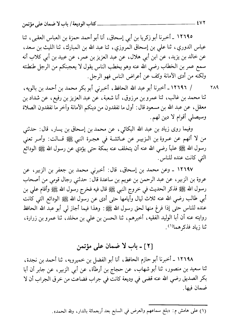 12698 - أَخْبَرَنَا أَبُو حَازِمٍ الْحَافِظُ , أنا أَبُو الْفَضْلِ بْنُ خَمِيرَوَيْهِ , ثنا أَحْمَدُ بْنُ نَجْدَةَ , ثنا سَعِيدُ بْنُ مَنْصُورٍ , ثنا أَبُو شِهَابٍ , عَنْ حَجَّاجِ بْنِ أَرْطَاةَ , عَنْ أَبِي الزُّبَيْرِ , عَنْ جَابِرٍ , أَنَّ أَبَا بَكْرٍ الصِّدِّيقَ رَضِيَ اللهُ عنْهُ §" قَضَى فِي وَدِيعَةٍ كَانَتْ فِي جِرَابٍ فَضَاعَتْ مِنْ خَرْقِ الْجِرَابِ أَنْ لَا ضَمَانَ فِيهَا "